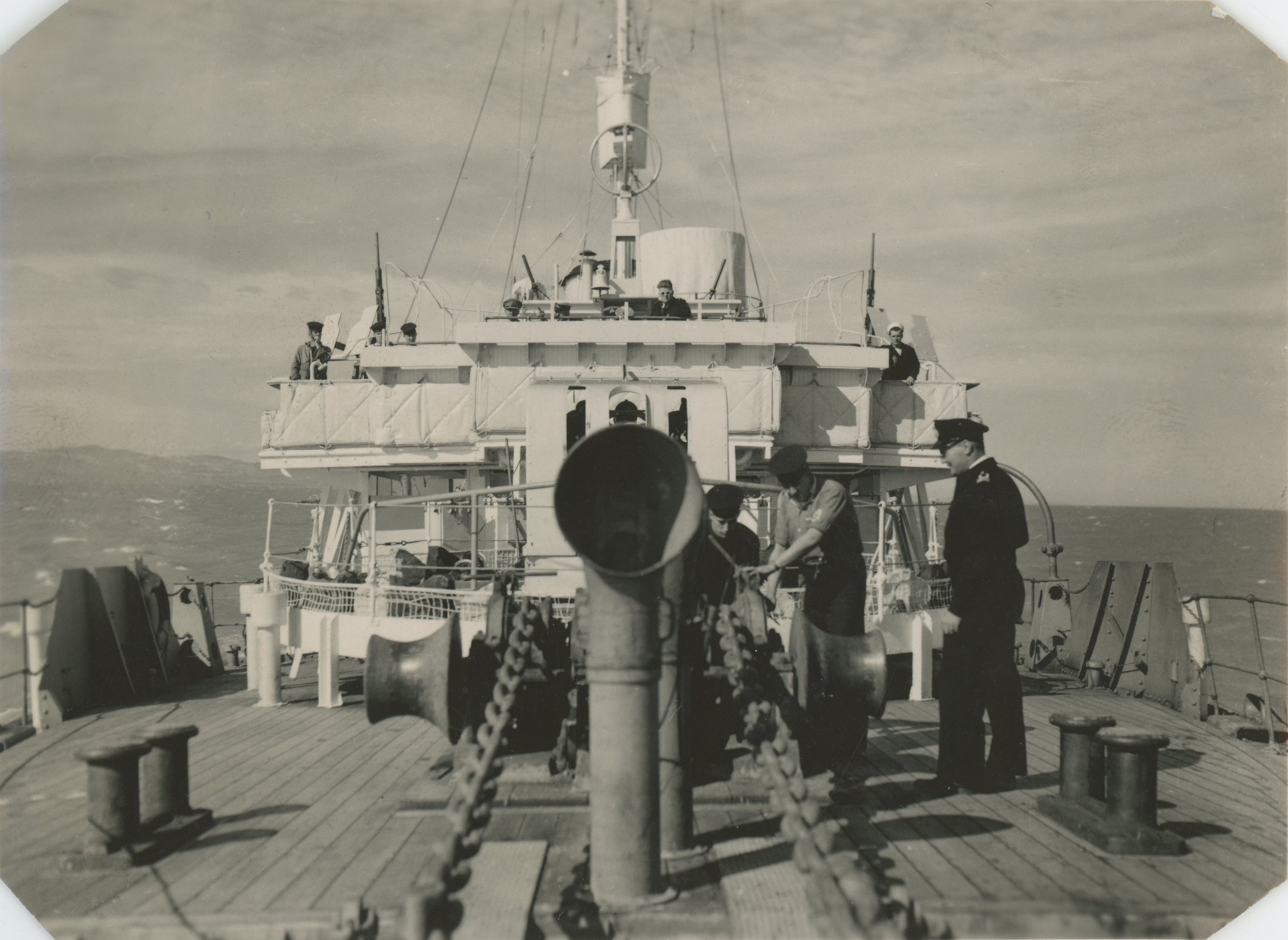 (RFG010) HMCS CHICOUTIMI K156 - 1943 (RFG011) HMCS CHICOUTIMI K156 - undated (RFG012 - RFG013) The bridge, gun deck and fo'c's'le of HMCS CHICOUTIMI K156 seen from the Crow's Nest