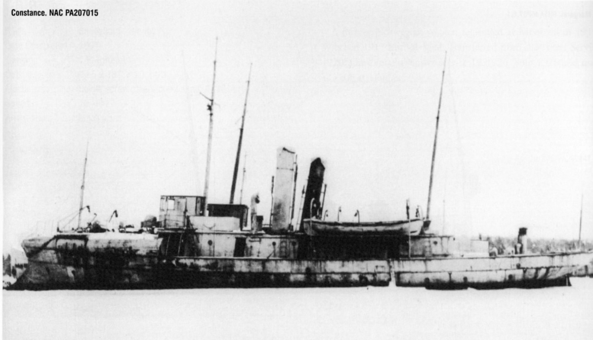 Constance was 125 feet long but less than 20 feet wide. Her 50 horse power engine gave a top speed of 11.6 knots. The ship, along with her sisters, was built for fisheries patrols in the Great Lakes but the Constance was transferred almost immediately to the Department of Customs and attached to the Customs Preventive Service to help address the problem of smuggling in the Lower St. Lawrence and Gulf areas. She was based for several years in Quebec where the photo above was probably taken. In 1912 the Constance, along with the Curlew and the Petrel (both of which had also been transferred to the east coast) were fitted with minesweeping gear and on the outbreak of war the three vessels were taken into naval service. HMCS Constance, armed with three machine guns, was used throughout the war for patrol and examination duties.