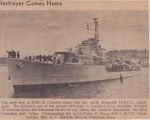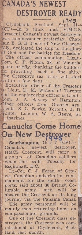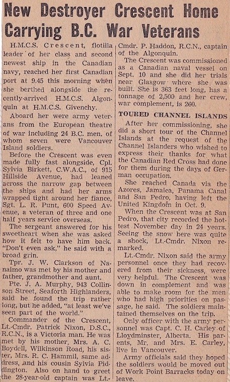 (HJS033) Newspaper article on the arrival of HMCS CRESCENT at Esquimalt, BC (HJS034) Newspaper articles on the arrival of HMCS CRESCENT at Esquimalt, BC (HJS035) "Hello darling! Welcome home! // Newspaper article on the arrival of HMCS CRESCENT at Esquimalt, BC (HJS036)Newspaper article on the arrival of HMCS CRESCENT at Esquimalt, BC From the collection of Howard (Jack) Simmons, RCNVR Courtesy of RCSCC Bowmanville