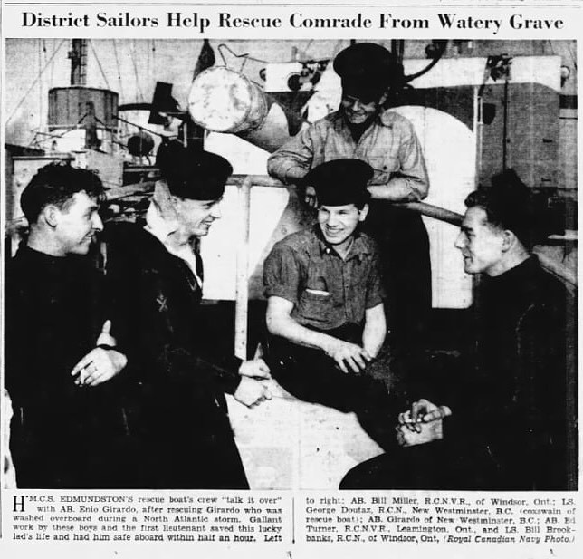 (EMS005) Seaman Enio Girardo by the gun mount on HMCS EDMUNSTON after having been washed overboard in a storm and rescued by his shipmates on 31 Oct 1943 (EMS006) Kodachrome. Able Seaman Enio Girardo of the corvette HMCS EDMUNDSTON (K106), who was rescued by his shipmates after being washed overboard in a storm at sea. St. John's, Newfoundland, 13 October 1943. // Credit: Lt Gerald M. Moses, RCN Photographic Section Source: Library and Archives Canada (EMS007) AB Enio Girardo taking with the ship's boats crew after his rescue: L-R: AB Bill Miller, RCNVR of Windsor, ON; LS George Doutaz, RCN of New Westminster, BC; AB Giraro of New Westminster, BC; AB Ed Turner, RCNVR of Leamington, ON and LS BIll Brookbanks, RCN of Windsor, ON.