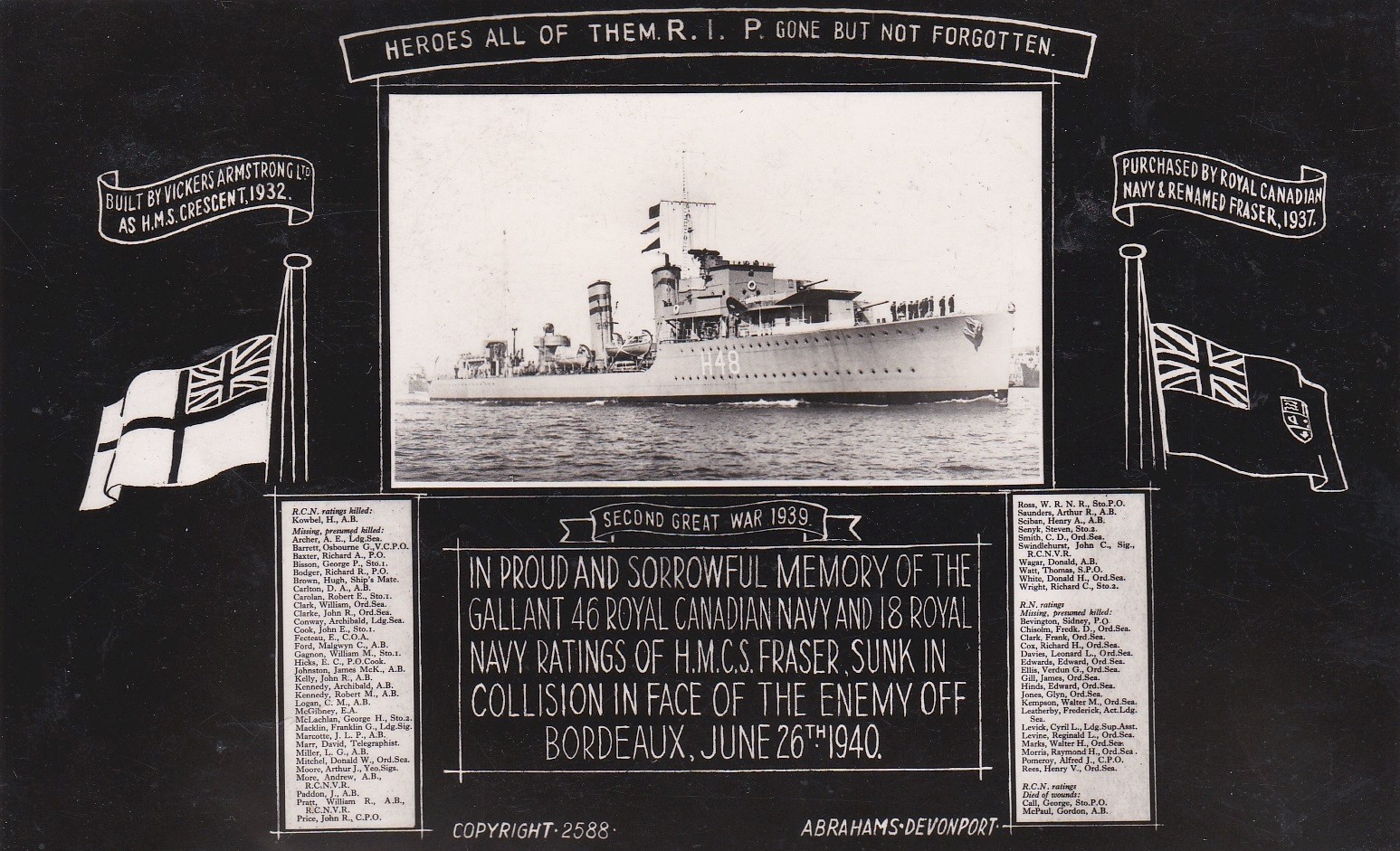The FRASER went to the bottom in the early hours of June 26 - Canada's first naval loss of the Second World War. Rescue efforts by the RESTIGOUCHE and CALCUTTA, and by the officers and men of the FRASER themselves saved many, but 65 of her ship's company were lost. Most of those who survived went down four months later, on October 23, with HMCS MARGAREE.
