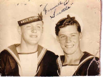 "Farewell to Seattle" - In happier times - HMCS FRASER sailors Seaman Kenneth Kyle (right) and friend Willie (William Goldsmith) Excerpt from a unknown newspaper: "Netha Silver and Thelma Mc Donald, two Halifax girls, heard together the news that their fiances were missing. Dan Willis, of Hanna, Alta., and Ken Kyle, of Moose Jaw, had planned to be married in a double wedding when the Margaree arrived in port. Archie Kennedy, of Victoria, B.C., who was to have been best man, died in the FRASER sinking, which the two other sailors survived." From the collection of Kenneth Kyle Courtesy of Maureen Pepin