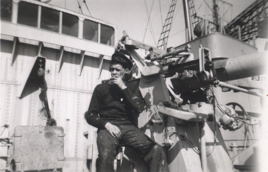 Unknown sailor by the gun mount on HMCS GANANOQUE