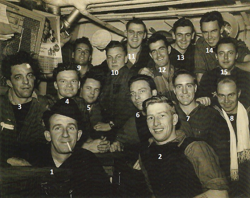(AWW043) Sailors in a mess deck on HMCS GODERICH J260 // Arthur Witt is #10 // Click here to view the photo with numbers