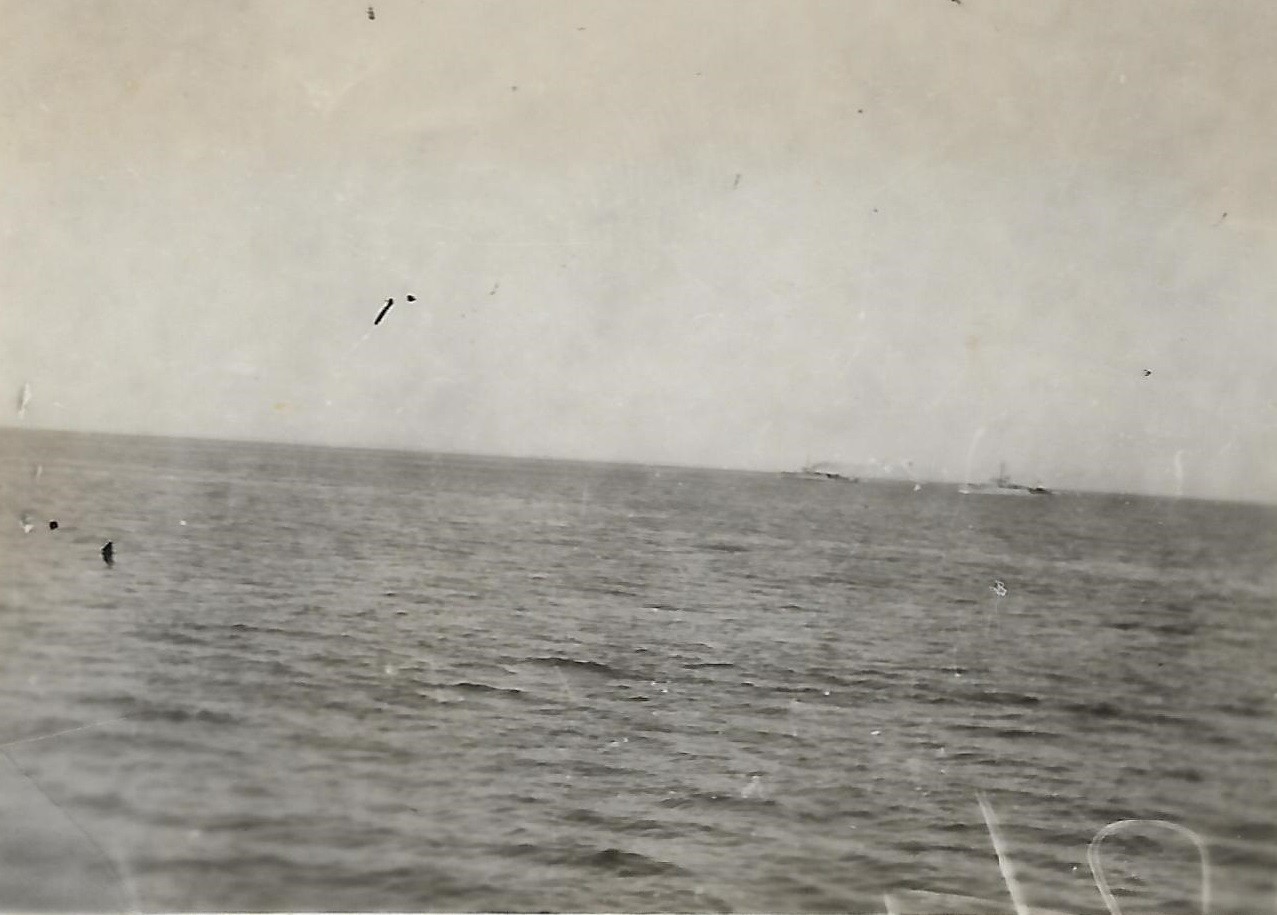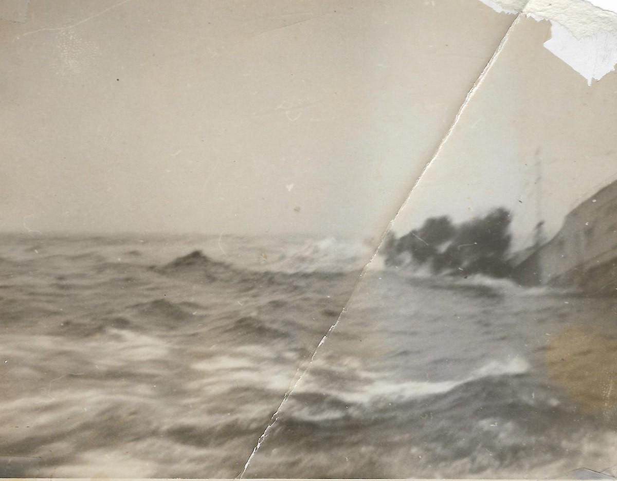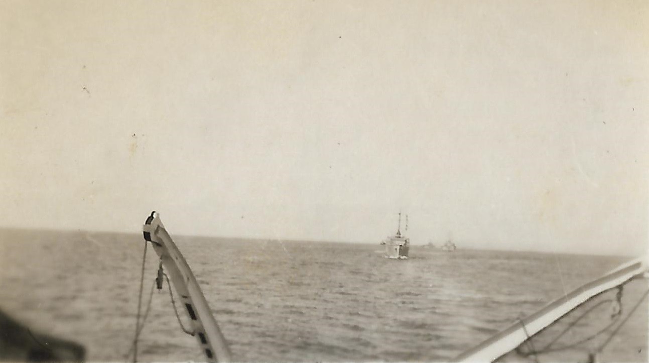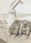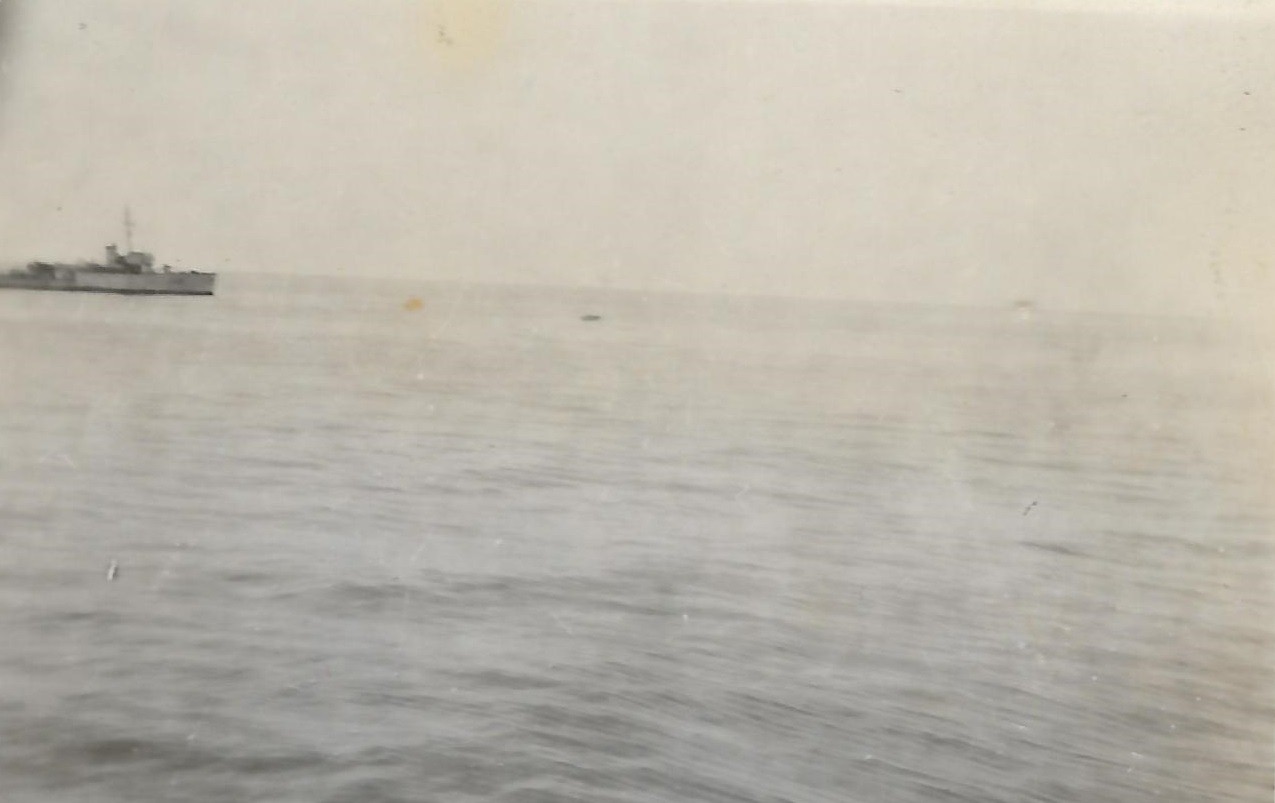 (PP004) HMCS GODERICH sinking the bow section of the "SS British Freedom" with depth charges // This above photo is from the collection of Paul Pigeon. It is not known who Jean-Guy Desforges (of 8245 Berri Nor, Montreal) is - crew member of GODERICH or perhaps a survivor of the merchant ship. If you have any info on him please send me an email. (PP005) HMCS GODERICH J260 in drydock at Saint John, NB, being repaired after her collision with tanker Iocoma in Halifax harbour (PP006) L-R: Boam, Pigeon, Cunningham, unknown, unknown (PP007) In the galley on HMCS GODERICH - L-R: Boam, unknown, Pigeon From the collection of Paul Pigeon, Cook (S), RCNVR Courtesy of Patricia Pigeon