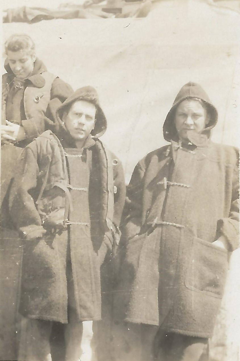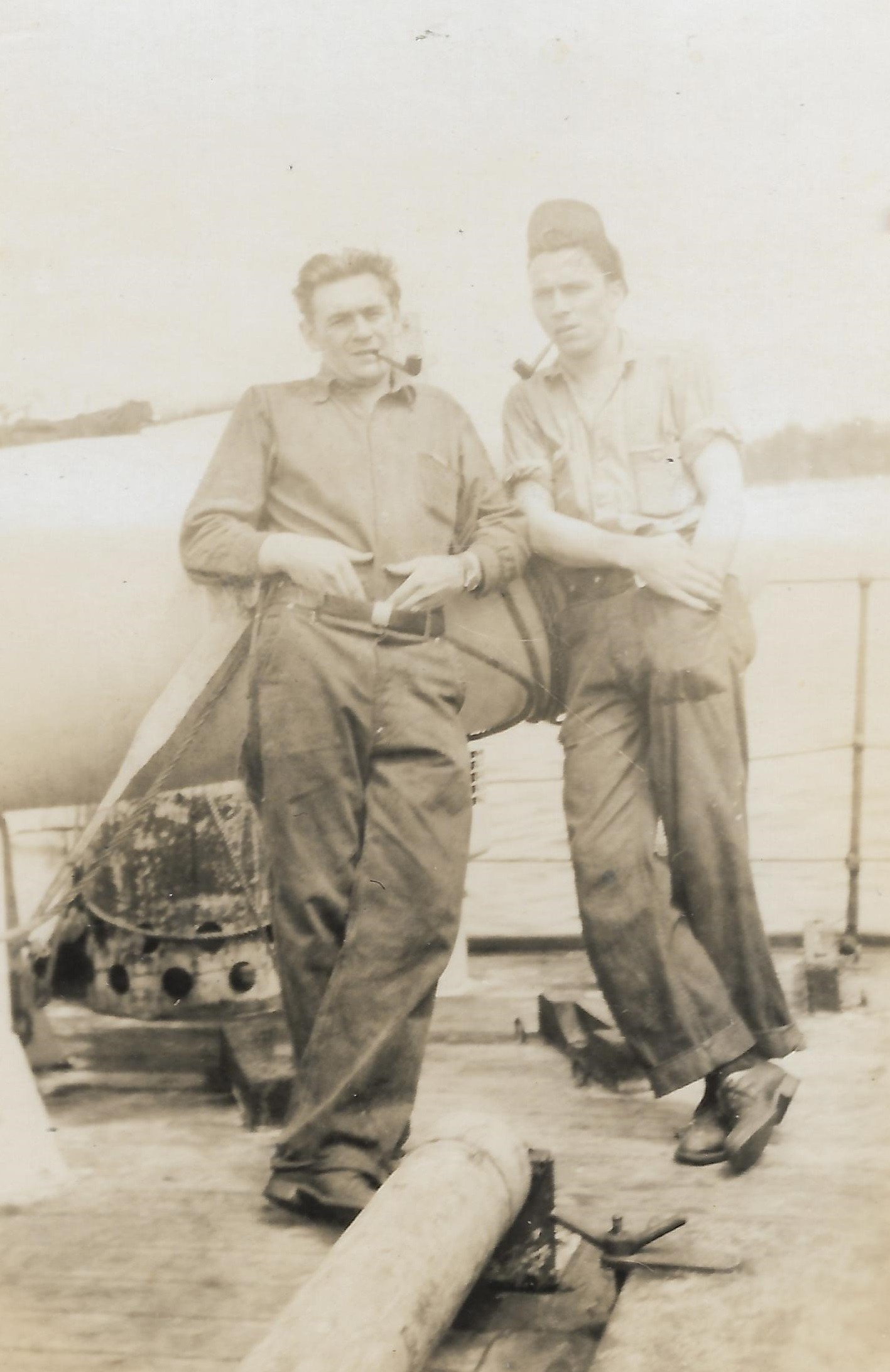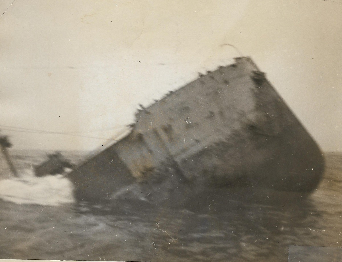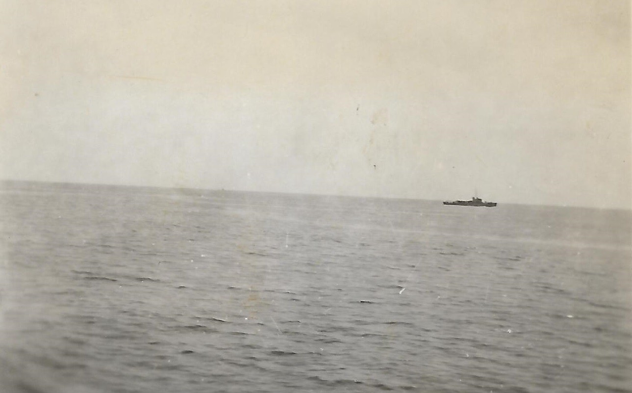 (PP004) HMCS GODERICH sinking the bow section of the "SS British Freedom" with depth charges // This above photo is from the collection of Paul Pigeon. It is not known who Jean-Guy Desforges (of 8245 Berri Nor, Montreal) is - crew member of GODERICH or perhaps a survivor of the merchant ship. If you have any info on him please send me an email. (PP005) HMCS GODERICH J260 in drydock at Saint John, NB, being repaired after her collision with tanker Iocoma in Halifax harbour (PP006) L-R: Boam, Pigeon, Cunningham, unknown, unknown (PP007) In the galley on HMCS GODERICH - L-R: Boam, unknown, Pigeon From the collection of Paul Pigeon, Cook (S), RCNVR Courtesy of Patricia Pigeon