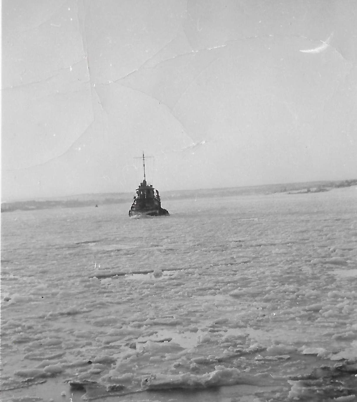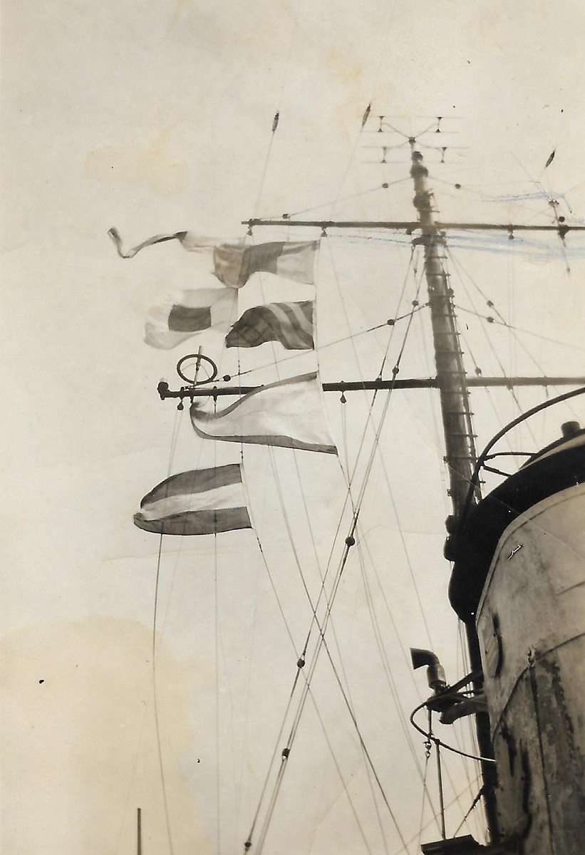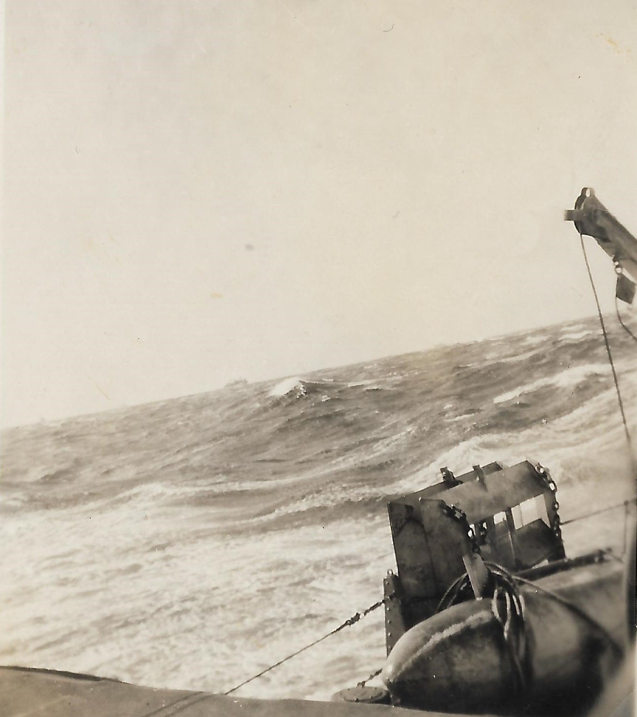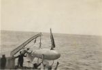 (AWW074) Flags and pennants on HMCS GODERICH for V.E. Day (AWW075) Sweep deck of HMCS GODERICH - rough seas (AWW076) Sweep deck of HMCS GODERICH - line secured to the paravane (AWW077) HMCS GODERICH (foreground) merchant ship on the horizon (AWW078) tug approaching HMCS GODERICH through ice