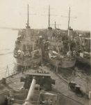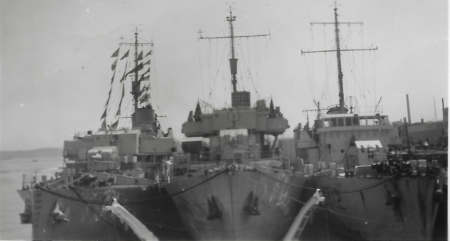(AWW080) Minesweepers alongside Halifax (AWW081) Photo appears to be of Halifax Harbour (AWW082) Two corvettes and a minesweeper in Halifax. Outboard corvette is HMCS Barrie K138 - identified by the artwork on the face of her bridge. The minesweeper (inboard) is HMCS Kentville J312 (AWW083) Hospital ship Lady Nelson (AWW084) unknown vessel - possibly a troop ship