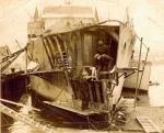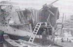 (GDR001) HMCS GODERICH J260 (GDR002) HMCS GODERICH J260 in drydock being repaired after her collision with tanker Iocoma in Halifax harbour // From the collection of John Stewart, Sub-Lieutenant, RCNVR // Courtesy of Jim Stewart