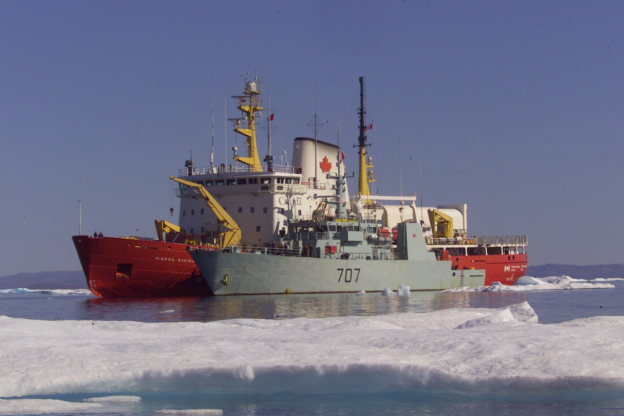 (GBY006) HMCS Goose Bay refueling with the Coast Ship the Pierre Radisson during OP NARWHAL - 03 Aug 2002 // RCN image # HS022502d22 (GBY007) HMCS GOOSE BAY 707 passing by an iceberg - 07 Apr 2003 // RCN image # HS030260d01 // Old neg. no. HS2002-0434-10. (GBY008) HMCS GOOSE BAY 707 passing Jetty NB, HMC Dockyard, Halifax, NS - 14 Aug 2003 // Photographer: MCpl Colin Kelley, Formation Imaging Services, Halifax, Nova Scotia // RCN image # HS030699d25 (GBY009) HMCS GOOSE BAY circa 2005 // Photo of HMCS GOOSE BAY 707 taken from SHAWINIGAN 704 during the 2005 Loyal Mariner trip. We hit a peak of over 13M waves during a storm on our way to the Azores. At the height of the storm we rolled to 39 degrees and our props came out of the water and both shafts tripped causing a Engineering Emergency. The sweepdeck was under water as we rolled, almost causing a number of ships crew to be washed over the side while they were out on deck securing equipment. We got the shaftlines up and carried on. // Courtesy of Rick Bungay (GBY010) HMCS Goose Bay and the Coast Guard ship Henry Larson rest at anchor after the completion of OP LANCASTER, Pond Inet, Baffin Island - 21 Aug 2006 // Photographer: Sgt Dennis Power, Army News, CFB Shilo // DND-CAF image # AS2006-0515d