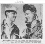 (HDA016) Article on HMCS HAIDA sailors from the Ottawa area home on leave // Names in the article: Tel William Watt (of Picton); L/Sto George Horsfield (of Ottawa); Sto PO Colin MacArthur (of Ottawa); AB Roland Belander (of Ottawa); AB Ken Bough (of Cornwall); L/Sto Earl Page (of Ottawa); LS Robert White DSM (of Ottawa); AB Mickey Kerwin (of Ottawa); Sto Rod MacDonald (of Ottawa); Tel William McKinnon (of Ottawa); Tel Bryce Dixon (of Ottawa); AB Johnny Bregg (of Ottawa); AB Bill Spence (of Ottawa); AB Norman Stewart (of Ottawa) (HDA017) Trim from the bridge of HMCS HAIDA notched by Harry DeWolf to shows HAIDA'S "kills" // Courtesy of Tom Estabrooks