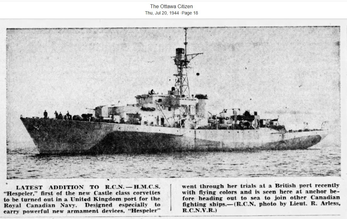 (HSP006) HMCS HESPELER during trials // The Ottawa Citizen 20 Jul 1944 (HSP007) Photo of HMCS HESPELER K489 that was used in the preceding Ottawa Citizen article