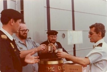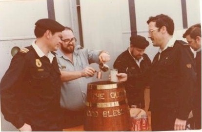 Tot time HMCS Iroquois 1979 - Then Commodore Edwards bought himself the rum barrel and wanted to commission it properly. What better way to do it than at sea, on a Sunday, off Trafalgar. UP SPIRITS ME LADS. Most famous comment of the day was by one OS who looked at me with glassy eyes and asked "Chief, is it true you guys did this every day?". Even the Commodore laughed.