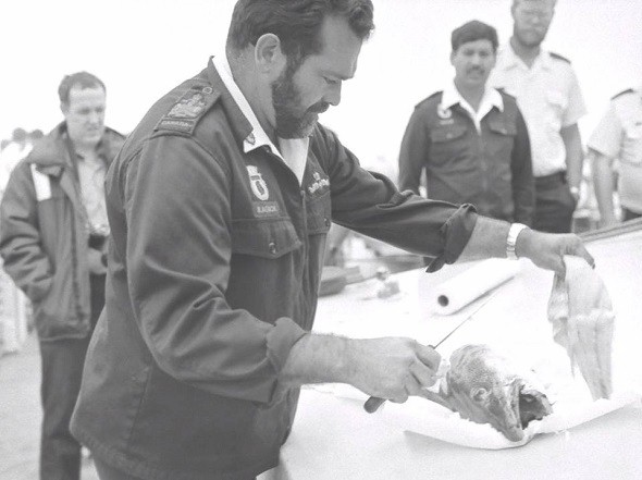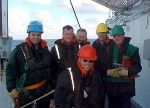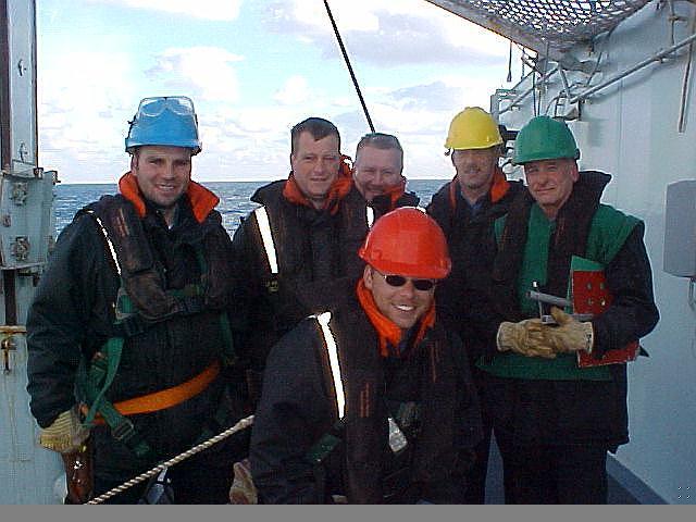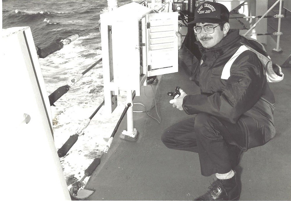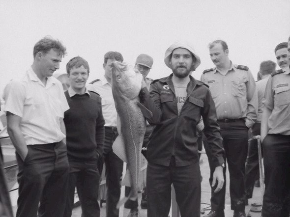 (IRO054 - IRO057) HMCS IROQUOIS crew members jigging cod at Virgin Rocks, Grand Banks, 1986 on the way home from a four month Standing Naval Force Atlantic deployment // Courtesy of John Newton, Rear-Admiral, RCN