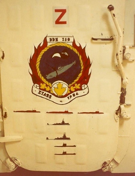 (IRO058) Mortar well door on HMCS IROQUOIS during EX MARCOT 84 // Courtesy of Pierre (Landry) Hébert (IRO059) Mario Cordeau, Met Tech (aka Weather Witch) on HMCS IROQUOIS 280 - 1987 // Courtesy of Mario Cordeau (IRO060) HMCS IROQUOIS' Schedule for 1988 (IRO061) "Stand Easy", HMCS IROQUOIS 10 Mess Mascott (IRO062) "Battle Ensign" for HMCS IROQUOIS 280 - this flag was flown at ships events and while conducting a RAS