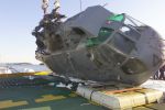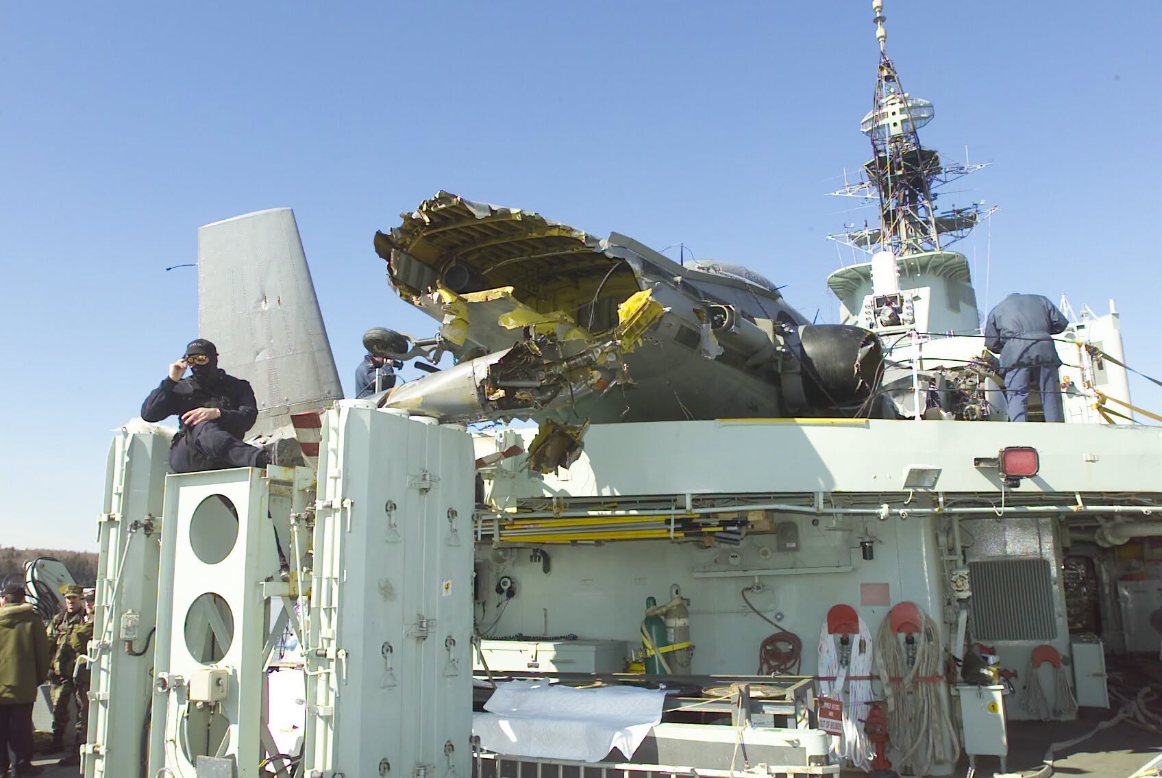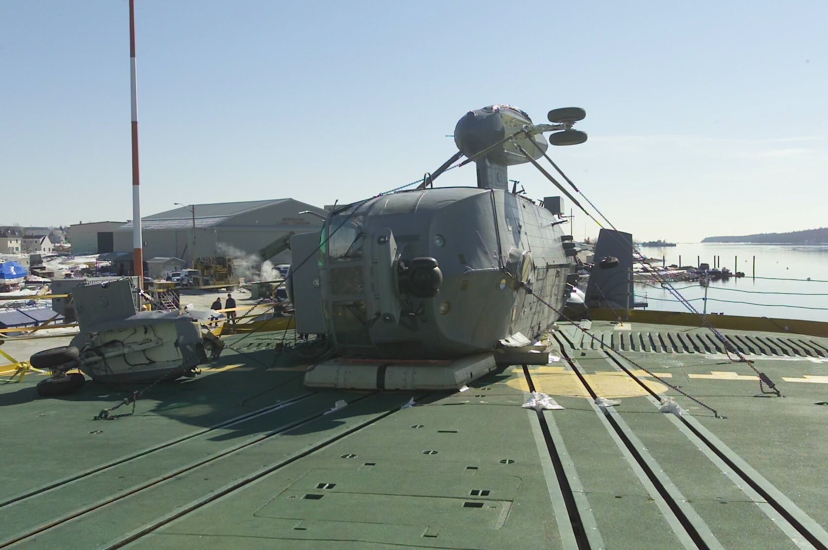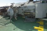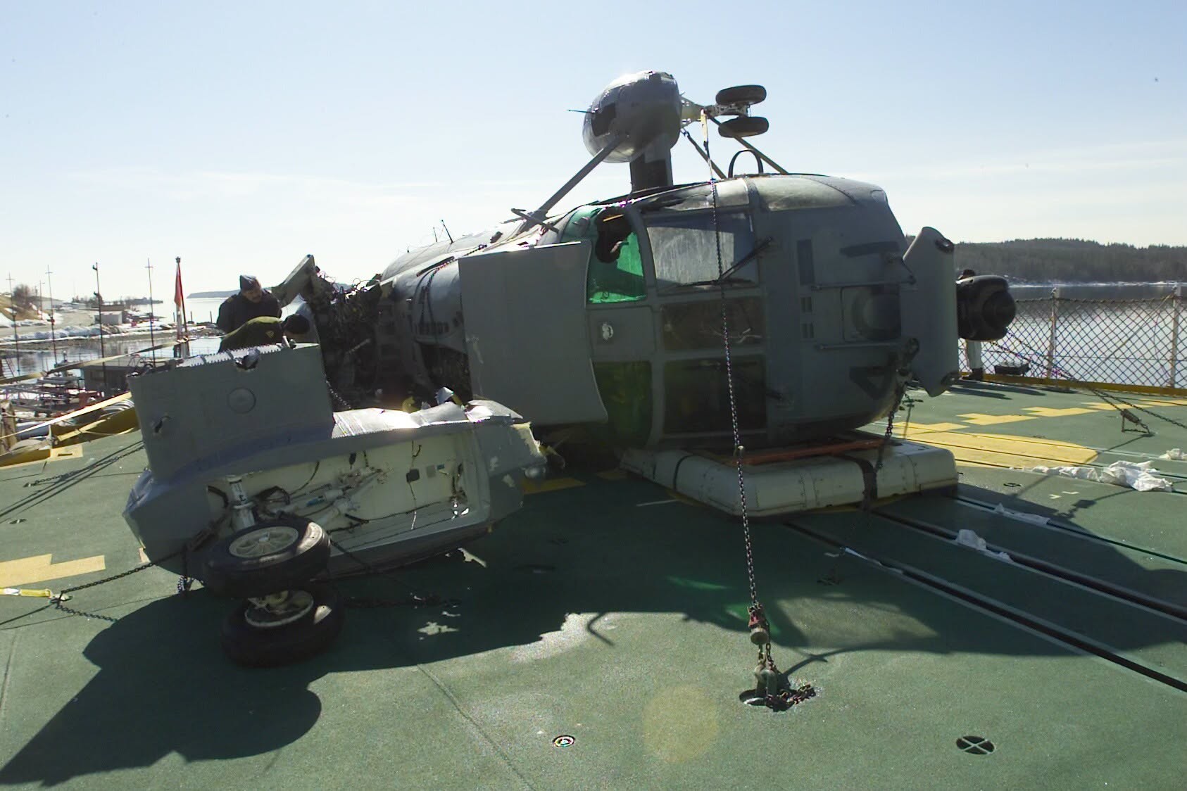 (IRO065 - IRO072) On 27 Feb 2003, after departing Halifax for a second Gulf War deployment, IROQUOIS's helo suffered a mechanical failure and crashed on deck. IROQUOIS returned to Halifax and the helo was craned off. With a new bird onboard, she resumed her deployment.