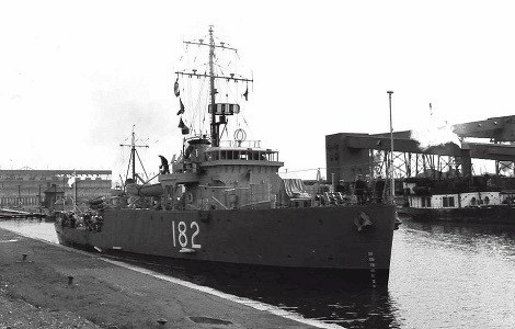 (AD94) HMCS KENTVILLE J312 with submarine HMS SEAWOLF secured outboard (AD95) HMCS KENTVILLE J312 in the slips getting repairs to her damaged bow From the collection of Allan Dougall, LCdr (E), RCN(R) Courtesy of David Dougall
