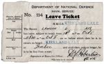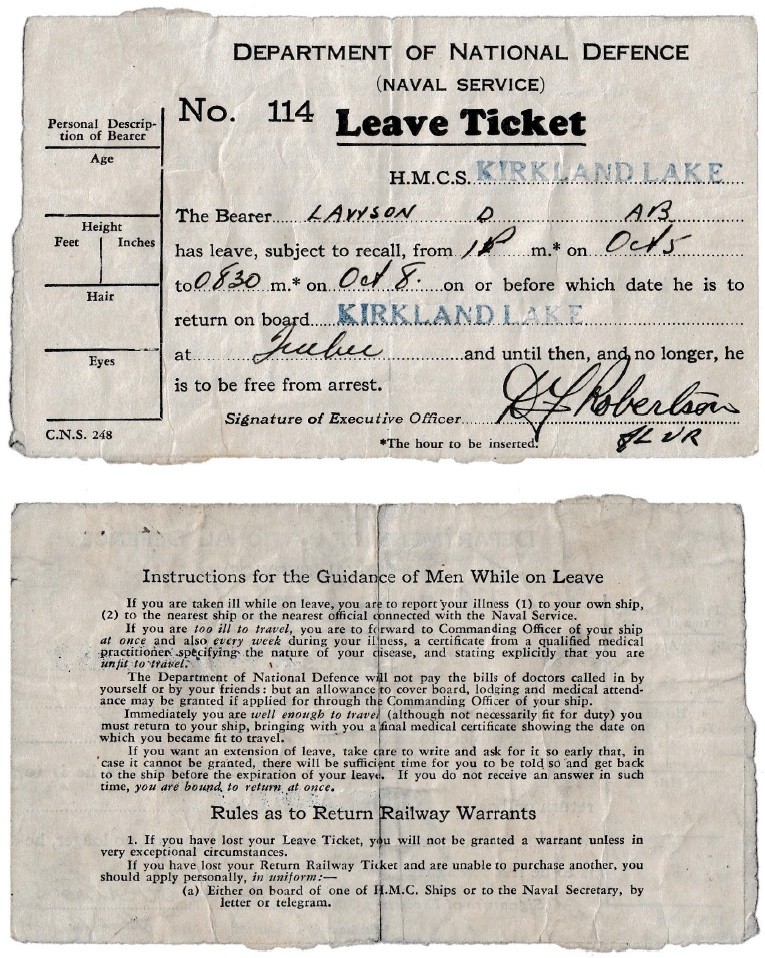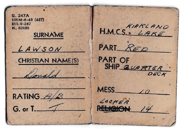 (DHL010) Leave Ticket for AB D. Lawson, HMCS KIRKLAND LAKE (DHL011) Telegram from OS Donald Lawson to his parents telling them he has been drafted to HMCS KIRKLAND LAKE (DHL012) Letter from OS Donald Lawson to his parents dated 22 Nov 1944. Note the parts of the letter removed by the censor (DHL013) OS D. Lawson's station card for HMCS KIRKLAND LAKE (DHL014) HMCS KIRKLAND LAKE scarf From the collection of Donald Lawson, Seaman Torpedoman, RCNVR Courtesy of Doug Lawson