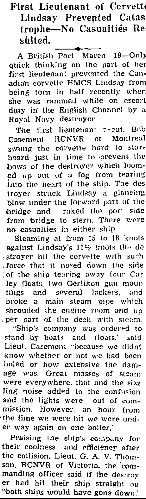 Newspaper article on the collision between HMCS LINDSAY and HMS Brilliant