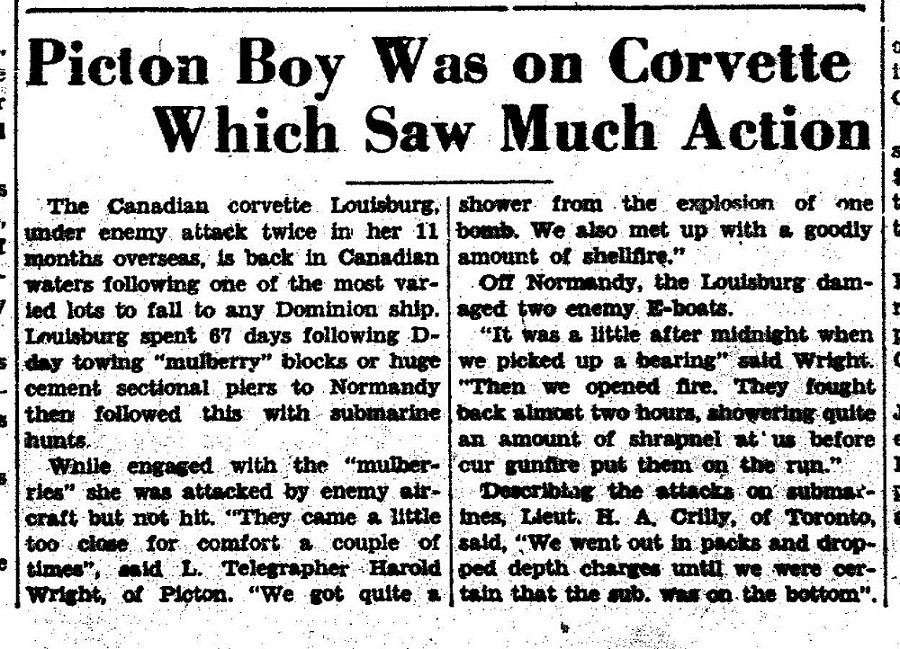 (LSB001) HMCS LOUISBURG K401 (LSB002) Picton Boy Was on Corvette Which Saw Much Action // Newspaper article on L/Tel Harold Wright of Picton and Lt H.A. Crilly of Toronto serving in HMCS LOUISBURG K401 // Picton Gazette 13 Apr 1945 // Source: Prince Edward County Archives Microfilm collection // Researched and complied by: © John Lyons 2018