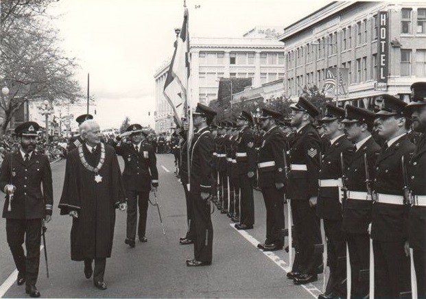 (MKZ006) Cooks off HMCS MACKENZIE in Japan, 1965 // L-R: LS Gordon Young, AB Peter Hemstreet, AB Larry Johansen, AB Phil Sullivan // Photo of Gordon Young 52 years later - Photo of Peter Hemstreet 52 years later // Courtesy of Gordon Young (MKZ007) HMCS MACKENZIE on SEATO Exercise Jet64 in Indian Ocean // © 1964 - Ken Watson RCN 1961-1968 (MKZ008) HMCS MACKENZIE 261 enroute to San Diego and the gunnery range at San Clemente Island circa 1980-1981 // Copyright / Courtesy of Brad Stewart // Not for commercial use without permission of Brad Stewart (MKZ009) Freedom of the City of Victoria is bestowed upon the crew of HMCS MACKENZIE in 1985 for the Navy's 75th anniversary. Admiral Thomas, LCdr Redman is the guard officer, and the Mayor (Peter Pollen) // Courtesy of Brian Forsyth (MKZ010) HMCS MACKENZIE 261 with HMCS SASKATCHEWAN on her starboard side and HMCS ORIOLE astern // DND-RCN photo