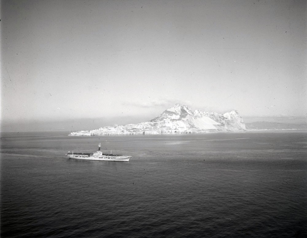(MAG046) HMCS MAGNIFICENT // From the collection of Gordon Broster (MAG047) MAGNIFICENT in the straights of Gibraltar on the way to dropping off personnel and vehicles as part of the United Nations Emergency Force (UNEF) with the rock of Gibraltar in the background January 1957 LAC e010777391-v8 (MAG048) The Last Sunset - Cdr William Bremner salutes as the White Ensign is lowered at sunset on HMCS MAGNIFICENT for the final time // Source: CROWSNEST Magazine, Sep 1957