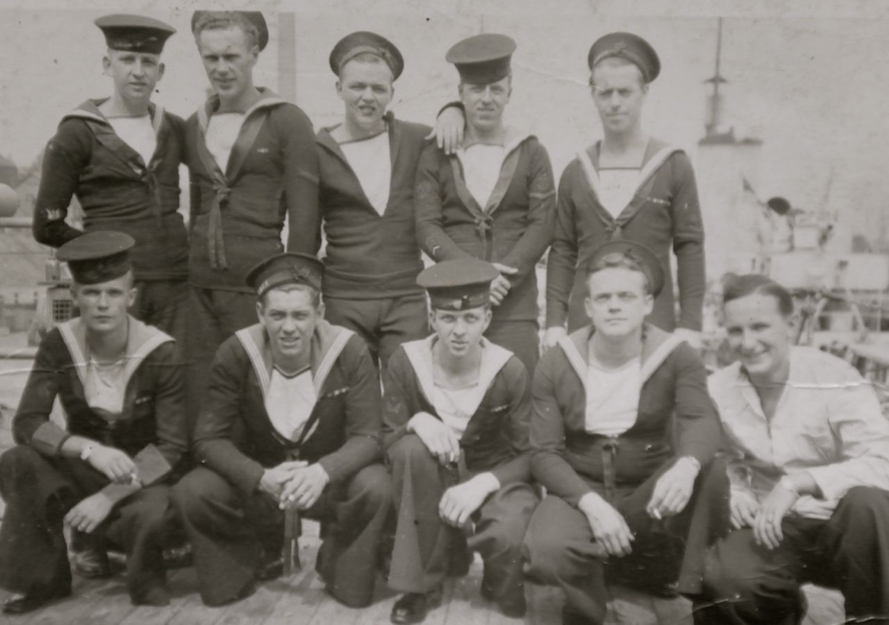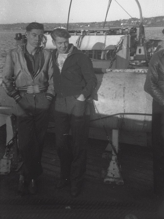 VE day at sea on HMCS MAHONE. Les Fontaine, centre, facing