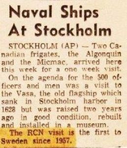 In Apr 1963, 12 RCN ships, ALGONQUIN, MICMAC, CAYUGA, ST CROIX, TERRA NOVA, KOOTENAY, SWANSEA, LA HULLOISE, BUCKINGHAM, CAPE SCOTT, CNAV BLUETHROAT and CNAV ST CHARLES, took part in NATO Exercise New Broom Eleven, an exercise designed to test convoy protection tactics. (click here to see the newspaper article).