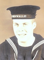 (GD01) Gregory Deck posing with local child while ashore from HMCS QUEBEC. Location unknown (GD02) Gregory Deck (left) ashore with shipmates from HMCS QUEBEC. Location unknown