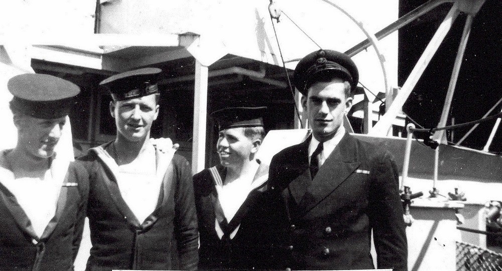 (JS227) McCarron on HMCS QUESNEL K133 (JS228) Simpson (JS229) Duggan (JS230) Hayes and Godfrey (JS231) Boat's crew - Mousseau and John (Jack) Quick - remainder unknown