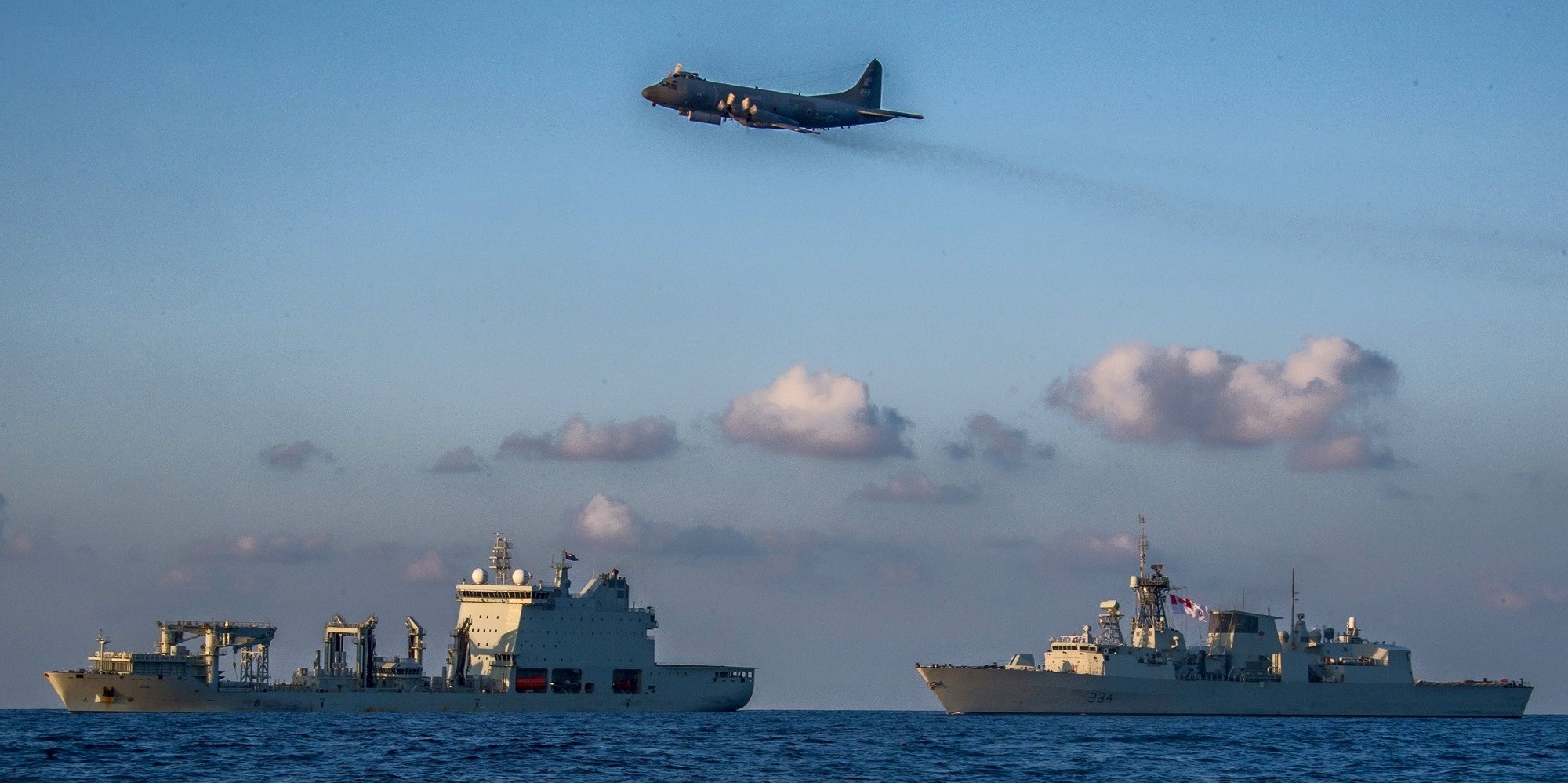 (REG006) Working with the Canadian led Combined Task Force 150, HMCS REGINA and NRU ASTERIX are operating alongside a CP-140M Aurora from 19 Wing Comox on OpArtemis, the CAF contribution to counter-terrorism and maritime security operations in the Arabian Sea. Op ARTEMIS is the Canadian Armed Forces contribution to counter-terrorism and maritime security operations in Middle East. HMCS REGINA is operating in the region as part of Combined Task Force 150 (CTF 150), currently led by Pakistan. CTF 150 is a task force under Combined Maritime Forces, a naval coalition of 33 nations that promotes security and stability in Middle Eastern and East African waters.