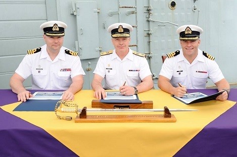 (REG001) HMCS REGINA 334 Gun shield art - Persian Gulf deployment 2003 // This artwork is based on the gun shield art of the WW 2 corvette HMCS REGINA K234 (REG002) HMCS REGINA 334 // Photo taken from USS Kitty Hawk 23 Jun 2008 (REG003) HMCS REGINA's crew is proud to unveil the new Gun Art, a homage to the first HMCS REGINA and our ties to the RCMP. HMCS REGINA K234 was a corvette that was sunk in action on the 8th of August 1944. Thirty of her crew died, but will be in our hearts on Remembrance Day. Lest we forget // DND - RCN photo 11 Nov 2018 (REG004) Commander (Cdr) Daniel Charlebois (left), incoming Commanding Officer, with Commodore (Cmdr) Scott Bishop, reviewing officer and Cdr Jason Boyd (right) outgoing Commanding Officer sign the change of command certificates. Her Majesty Canadian Ship (HMCS) REGINA’s change of command ceremony was held on C3 Jetty at Canadian Force Base (CFB) Esquimalt on May 29, 2013. // Image by: Cpl Michael Bastien, MARPAC Imaging Services // DND-MND Canada 2013 (REG005) Incoming Commanding Officer Commander Colin Matthews (left), Reviewing Officer Captain (N) James Clarke (center) and outgoing Commanding Officer Commander Daniel Charlebois (right) sign the Change of Command Certificates during Her Majesty’s Canadian Ship (HMCS) REGINA Change of Command ceremony held at the Naval Officers Training Centre (NOTC) Drill Hall on July 21, 2015 // Image by: LS Ogle Henry, MARPAC Imaging Services // DND-MND Canada 2015