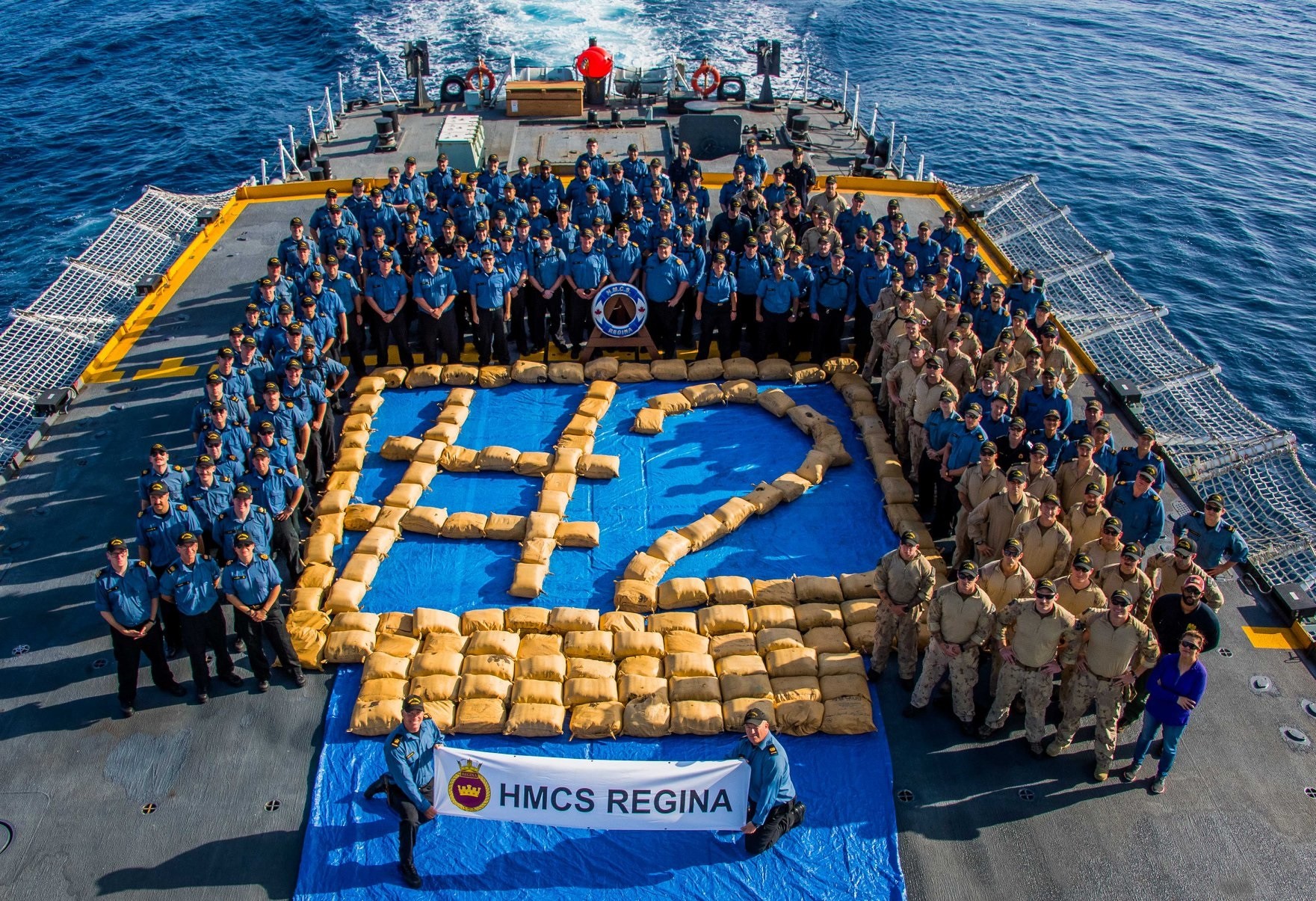 (REG014 - REG016) On May 3, 2019, HMCS REGINA seized 2,054 kg of hashish in the Northern Arabian Sea. This marks their 4th seizure in the region, totaling in 9,155 kg of narcotics seized to date. HMCS REGINA deployed its NTOG boarding team who conducted a search inside the vessel and found 100 hidden bags of hashish. The boarding team and HMCS REGINA’s ship’s company worked tirelessly in heat reaching 47 degree (Celsius) to transfer the hashish to HMCS REGINA for destruction. Source: Canadian Armed Forces Operations - Facebook page