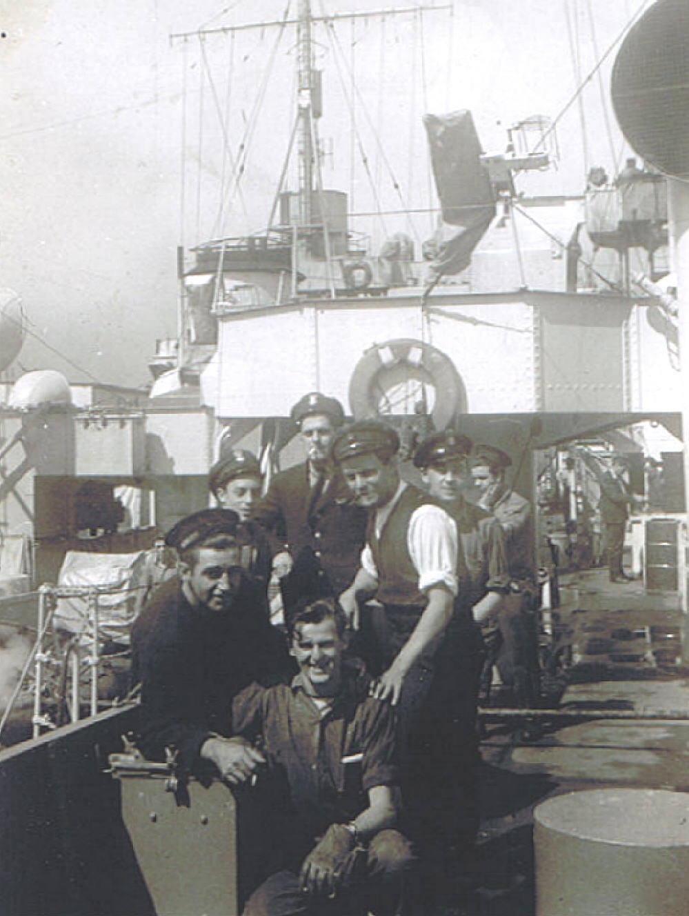 (JM101) Leaning against the bulkhead on HMCS RUNNYMEDE K678 - L-R: Frank Carey, Al Cormack and Dick Hayward. Sailor with his back to the camera unknown (JM102) L-R: Al Cormack, Joe Marshall and Bob Bacon on the boat deck of HMCS RUNNYMEDE K678 (JM103) On the boatdeck, leaning against the funnel on HMCS RUNNYMEDE K678 - L-R: Freddy Orton, Frank Carey, John MacNeil and Bob Vreeland (JM104) Arch Chambers, Royal Navy, by the after gun mount on HMCS RUNNYMEDE K678 (JM105) John Murphy (right) with unknown shipmate on the quarterdeck of HMCS RUNNYMEDE K678