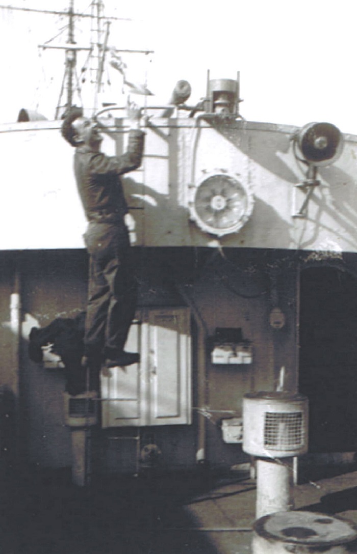 (JM106) John Murphy on the quarterdeck of HMCS RUNNYMEDE K678 by the ladder heading up to the after gun mount