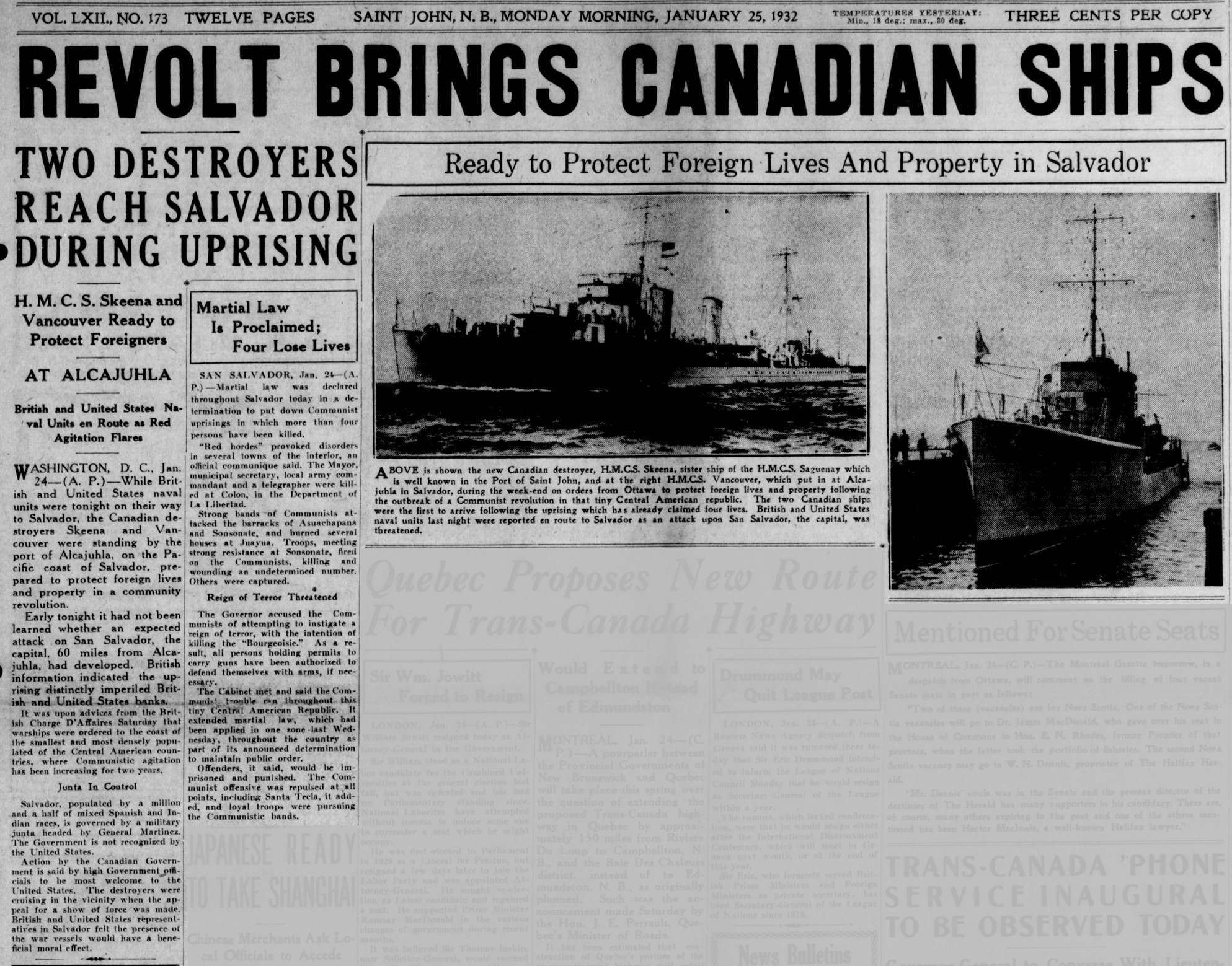 On 24 Jan 1932 HMCS SKEENA and HMCS VANCOUVER provided protection to British assets and civilians in El Salvador at the request of the British Consul in San Salvador following the outbreak of a peasant uprising. A landing party was briefly sent ashore at Acajutla, but the situation there improved and the sailors saw no combat. The two ships remained in the area until the end of the month. (click here to read an article on the deployment)