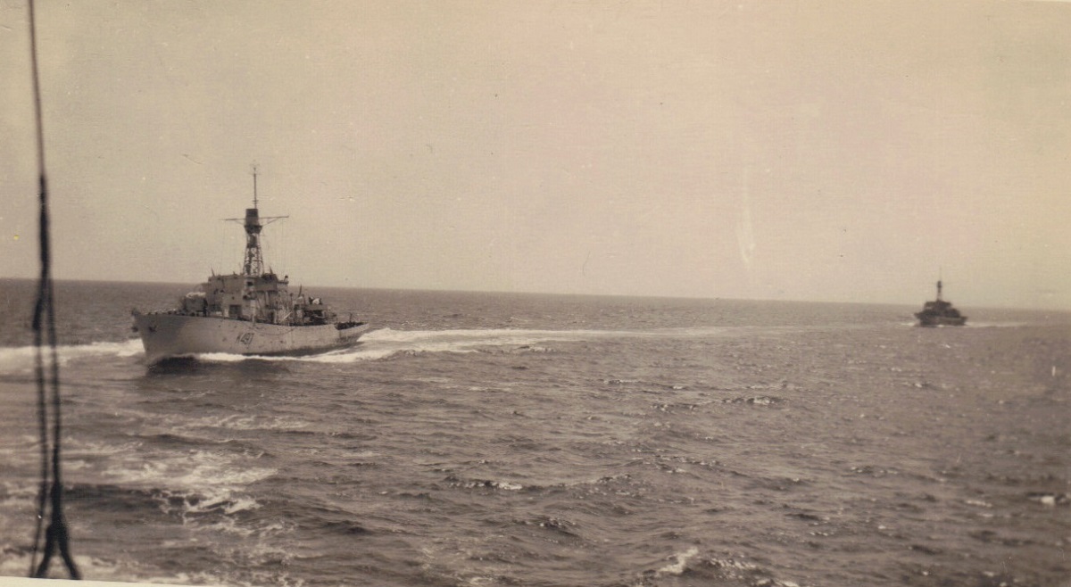 HMCS HUMBERSTONE K497 (RS66) L-R: unknown frigate, HMCS STONE TOWN