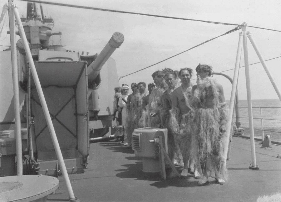 (UGA005) The gundeck of HMCS UGANDA after shelling Miyakojima in May, 1945. The ship in the distance is HMNZS GAMBIA. Courtesy of the CFB Esquimalt Naval and Military Museum: Image # VR2014.1.1 (UGA006) Officers from HMCS UGANDA visit El Alamein. In photo - Lt Eric Makovski, Instr Lt E. Smeathers and Capt H. Hollister. Crow's Nest newspaper - May 1945 (UGA007) Crossing the Equator on HMCS UGANDA. Crow's Nest newspaper - May 1945