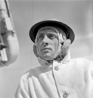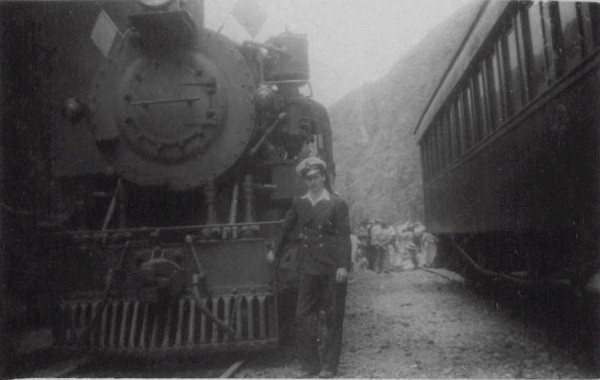 (LR30) King Neptune's Men - Crossing the Line (Equator) on HMCS UGANDA during her trip from the Pacific to the Atlantic - 1946 (LR31) HMCS UGANDA at anchor of Peru - 1946 (LR32) PO Larry Restall standing by a train in Perua steam locomotive in Peru. The train ran up the mountains using a series of switchbacks. At the end of the day they still had not got to the top, so they returned to their starting point. PO Restall had hoped to get up to Machu Pichu. (LR33) Petting a Llama, Peru, 1946