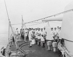 (JM87) Cooks on HMCS UGANDA (JM88) John McGowan by the forward 6-inch guns on HMCS UGANDA (JM89) Band and Guard formed up on the quarterdeck of HMCS UGANDA at sea - General Salute (JM90) Cooks on HMCS UGANDA