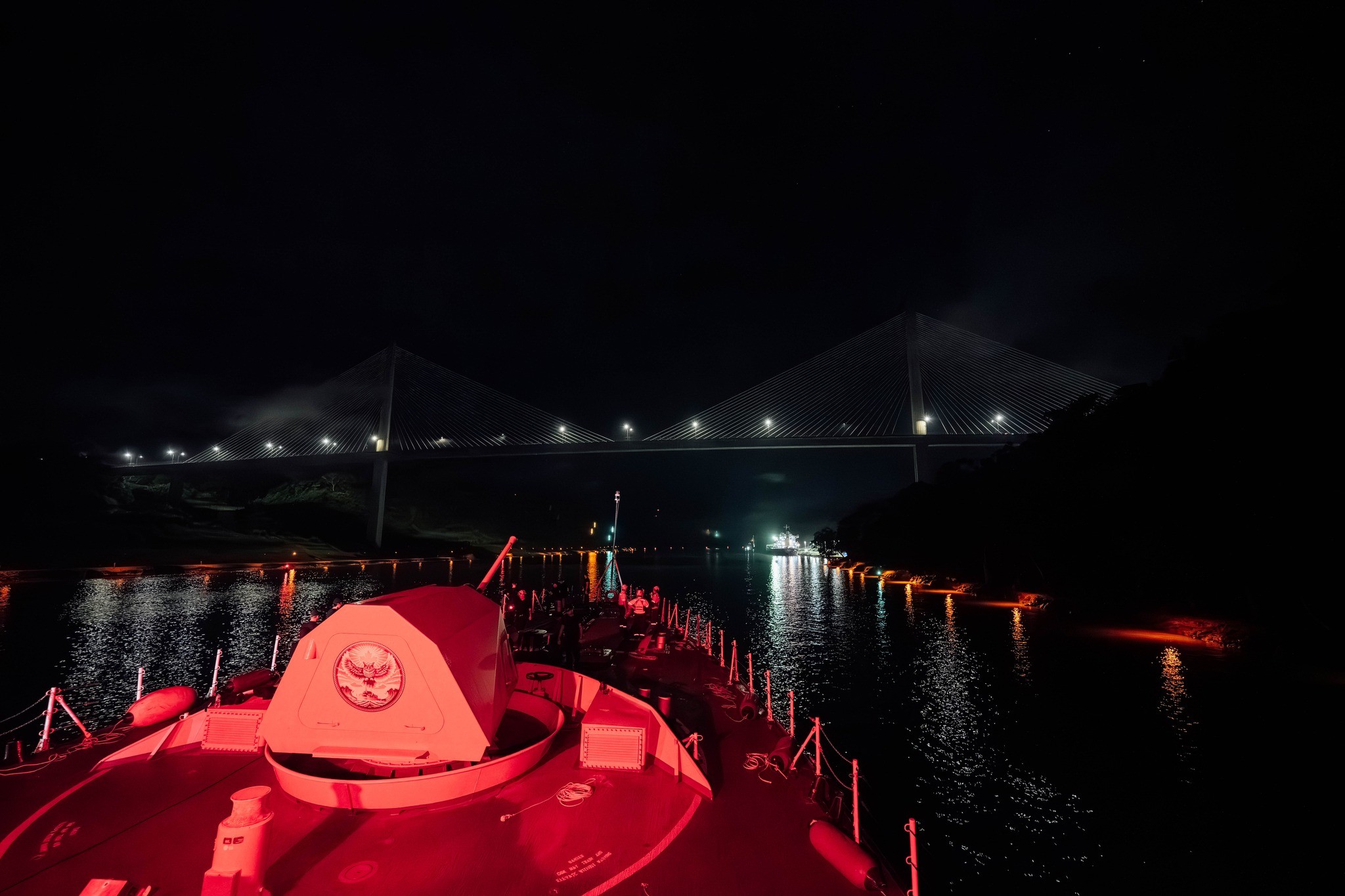 (VDQ008) HMCS VILLE DE QUÉBEC with two aircraft carriers - HMS PRINCE OF WALES on her port bow and USS GEORGE WASHINGTON on her starboard bow - and ten F-35s flying in formation overhead. Exercise OP HORIZON 2025 // Photographer: Cpl Brendan Gamache, Formation Imaging Service (VDQ009) HMCS VILLE DE QUÉBEC sails underneath the Al Salam Bridge in Egypt while transiting through the Suez Canal as part of the UK-led Carrier Strike Group during OP HORIZON - 24 May 2025 // Photographer: Corporal Brendan Gamache, Formation Imaging Service (VDQ010) SLt Jillian Rowan and S2 Audrey Merrifield paint the bullring of HMCS VILLE DE QUÉBEC red to symbolize the ship's crossing of the equator while sailing as part of the UK-led Carrier Strike Group during Op HORIZON in the Java Sea - 29 Jul 2025 // Photographer: Cpl Brendan Gamache, Formation Imaging Services