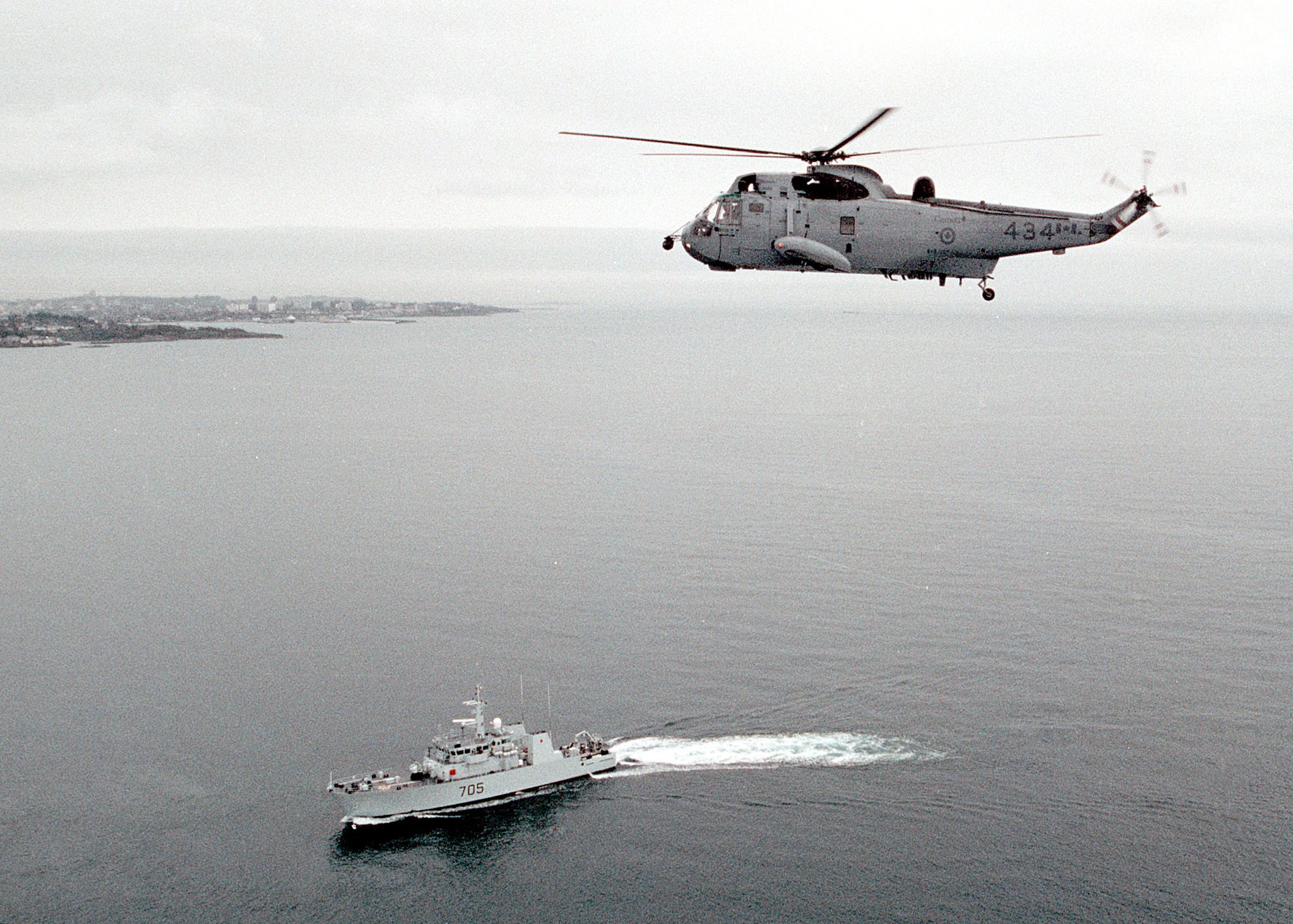 (WHT001) Official badge for HMCS WHITEHORSE 705 (WHT002) A Sea King Helicopter flies above HMCS WHITEHORSE 705 at the entrance of Esquimalt Harbour. RCN image # ETC00-0062-06 (WHT003) HMCS WHITEHORSE 705 departs Esquimalt ON 04 May 2000 for Rimpac 2000 // RCN image # ETC00-0123-09 (WHT004) HMCS WHITEHORSE 705 and HMCS BRANDON 710 at Y jetty, Esquimalt Harbour 15 Mar 2002 // RCN image # ETC02-0083-41 (WHT005) HMCS WHITEHORSE 705 at sea near Esquimalt, BC - 23 May 2003 // RCN image # HS030412d07