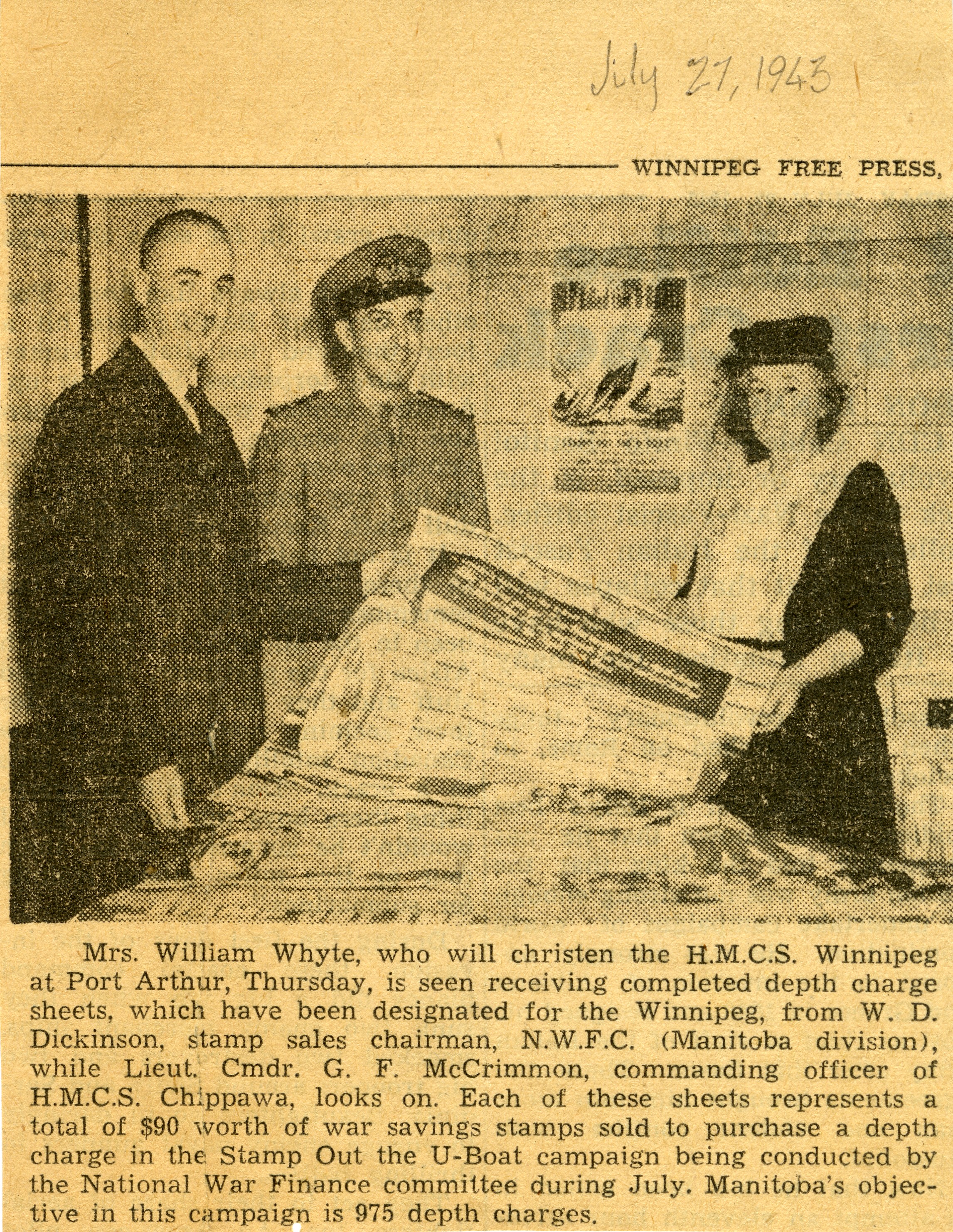 (WNI-NMoM003) Mrs. William Whyte, who will christen HMCS WINNIPEG, seen receiving completed depth charge sheets. Each sheet represents $90 worth of war savings stamps sold to purchase a depth charge. (WNI-NMoM004) Admiring Toots Greet Trim Fighting Ship - HMCS Winnipeg Is Maze of Wires and Gadgets, All Compactly Fitted (WNI-NMoM005) Through Trials - Final Preparations Made For Today's Christening Ceremony (WNI-NMoM006) Winnipeg citizens depart Winnipeg by CPR to attend the christening of HMCS WINNIPEG (WNI-NMoM007) Mayor Garnet Coulter addresses the officers and men of HMCS WINNIPEG at her christening ceremony
