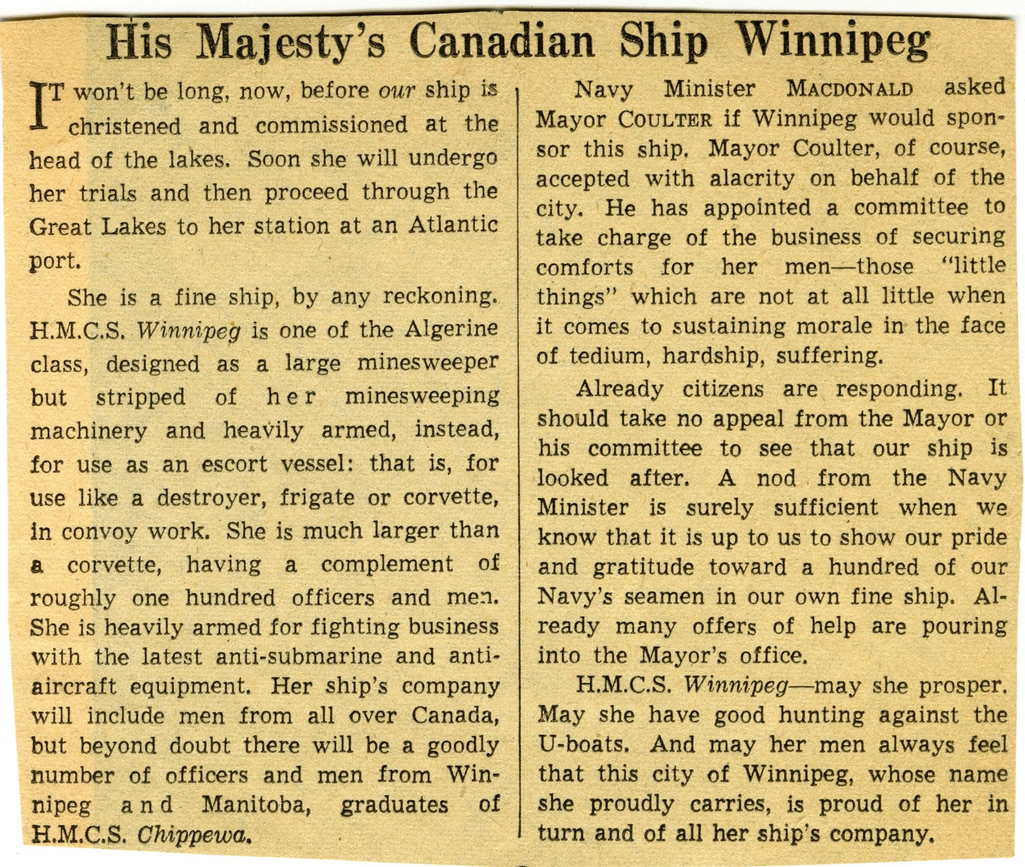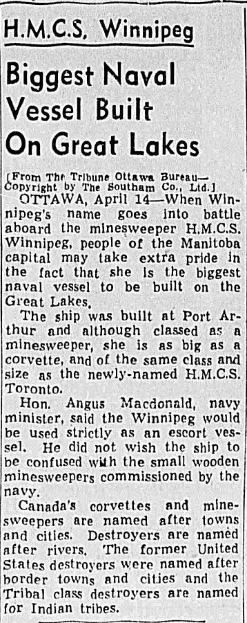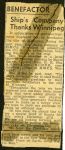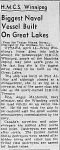(WNI-NMoM028) Mayor Coulter of Winnipeg inspects ship's company (WNI-NMoM029) Sailors Need Fur Jackets, 21 Apr 1943, The Morden Times (WNI-NMoM030) Flaw in Escort Ship's Four-inch Gun Ironed Out in Lake Ontario Test (WNI-NMoM031) HMCS WINNIPEG conducts gun trials on Lake Ontario (WNI-NMoM032) Christmas Cake for WINNIPEG