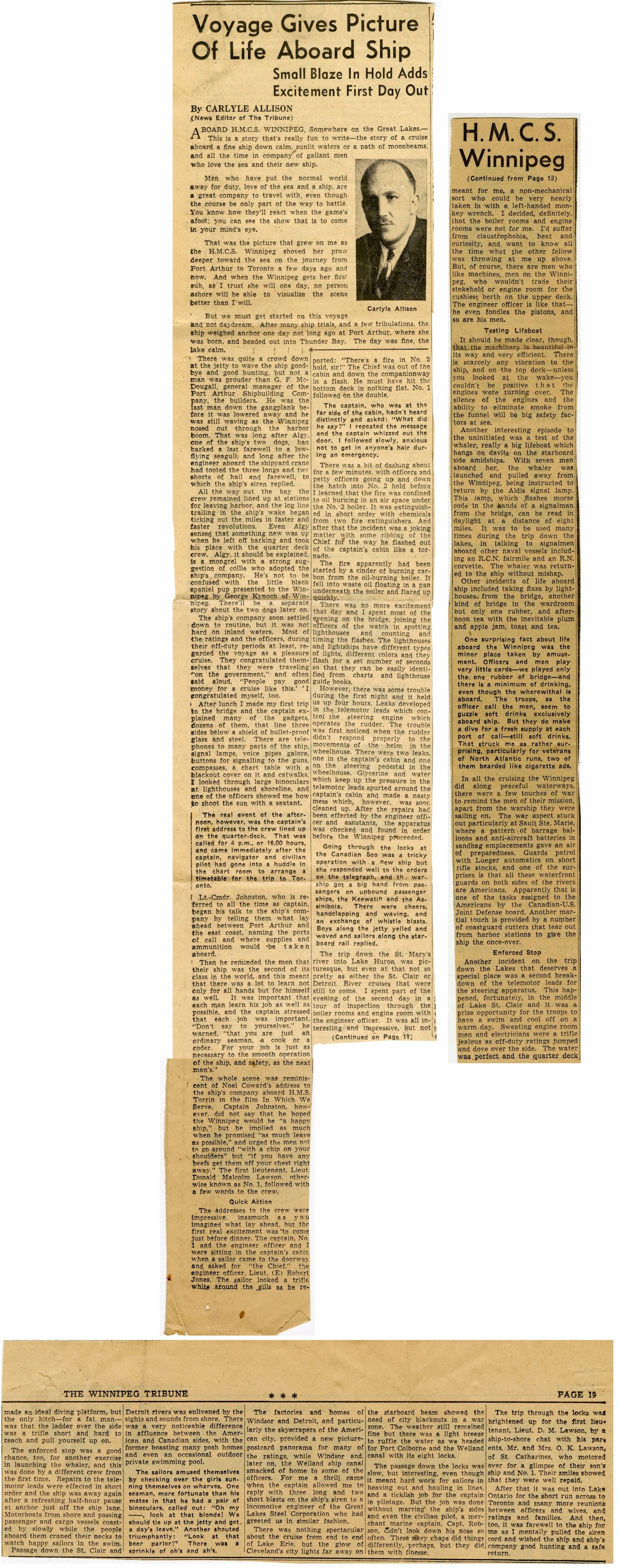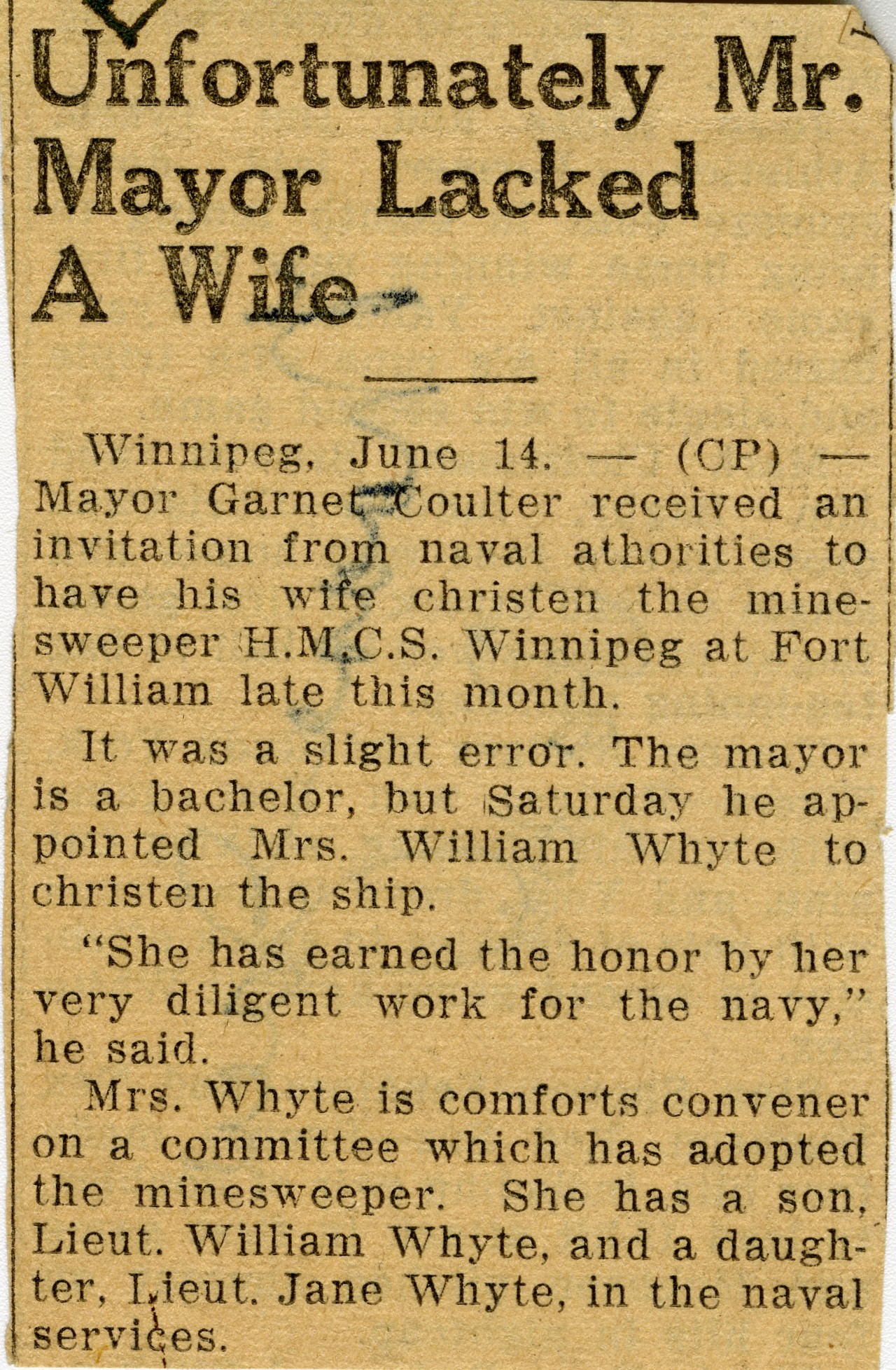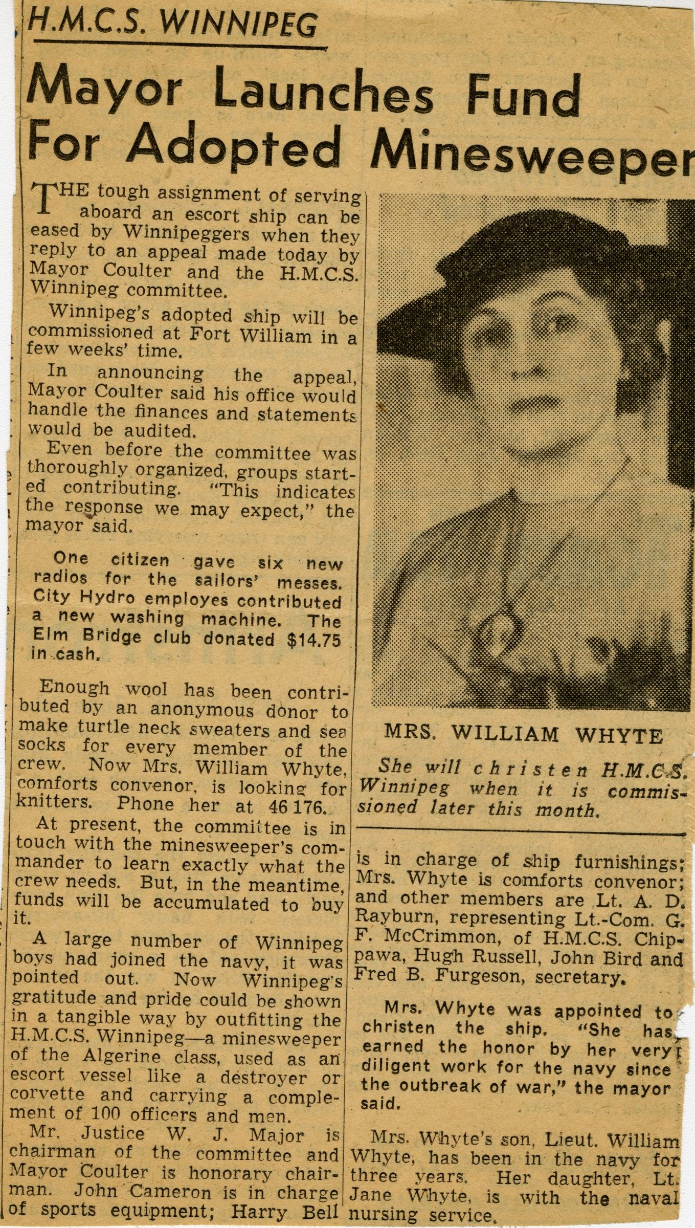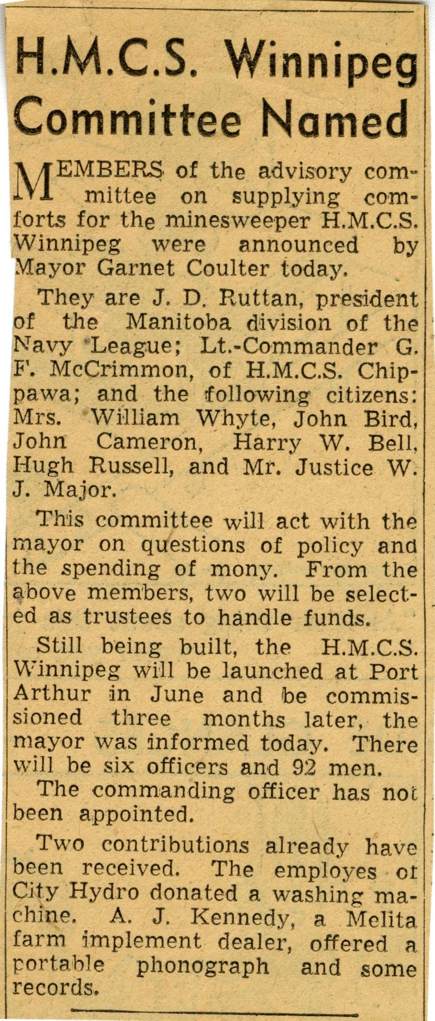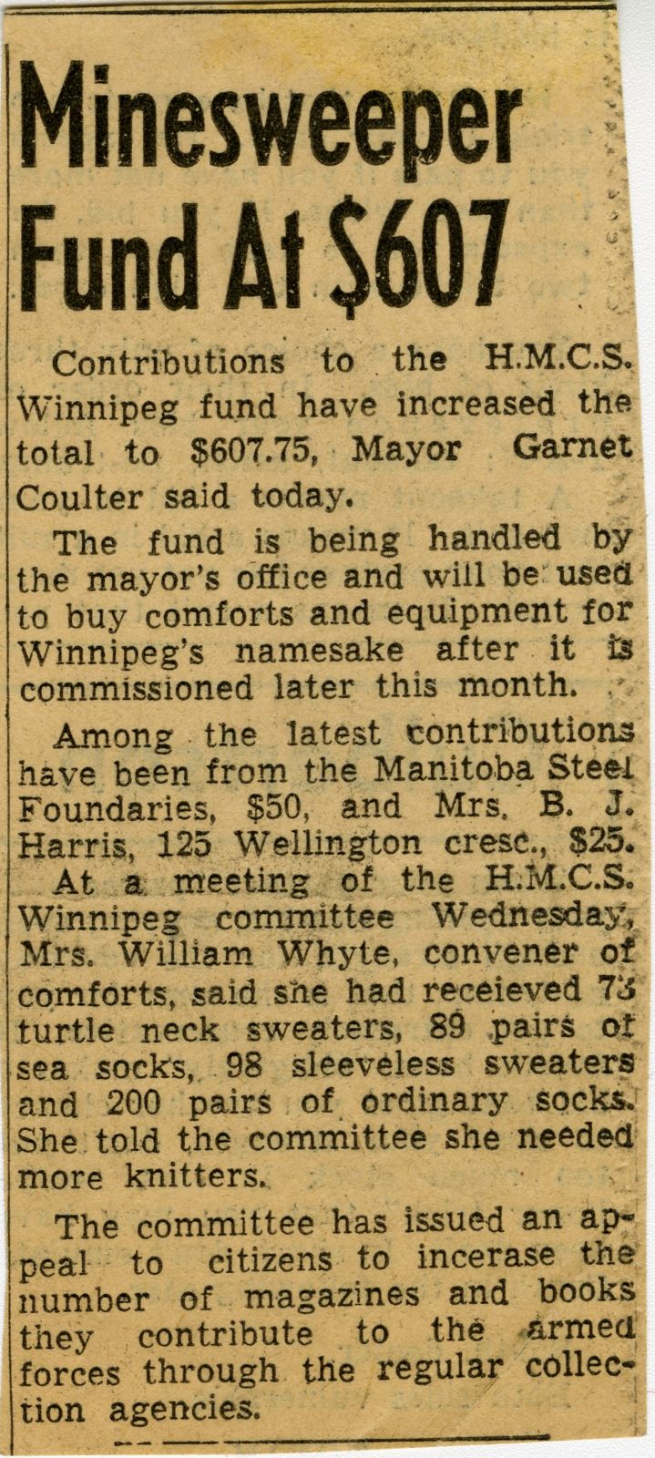 (WNI-NMoM018) Unfortunately Mr. Mayor Lacked A Wife (WNI-NMoM019) Mayor Launches Fund For Adopted Minesweeper (WNI-NMoM020) Minesweeper Fund At $607 (WNI-NMoM021) LCdr W. D. F. Johnston on special assignment - no longer in command of HMCS WINNIPEG (WNI-NMoM022) Ride on "WINNIPEG" Thrills Visitors