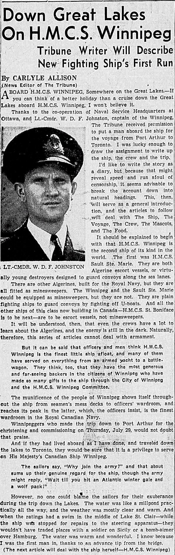 (WNI001) HMCS WINNIPEG - Biggest Naval Vessel Built on the Great Lakes // The Winnipeg Evening Tribune 14 Apr 1943 (WNI002) Down Great Lakes On HMCS WINNIPEG // The Winnipeg Evening Tribune 09 Aug 1943 (WNI003) HMCS WINNIPEG Knows The Meaning Of The Words "Merry Christmas" // Crow's Nest newspaper - Dec 1943 (WNI004) Sailors in the seaman's mess on HMCS WINNIPEG J337 // Source: The Military Museums of Calgary // Courtesy of Chris Skilling (WNI005) Memories of HMCS WINNIPEG J337 by R.A. Judges, LCdr, RCNVR // Article from an 85th Anniversary of the RCN souvenir magazine