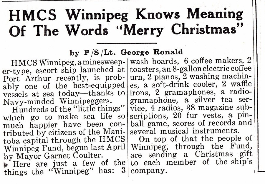 (WNI-NMoM033) "WINNIPEG" Greets Winnipeg - A Christmas message (WNI-NMoM034) Ship's Company Thanks Winnipeg (WNI-NMoM035) City's Ship Gets Wine and Water (WNI-NMoM036) Voyage Give Picture of Life Aboard Ship (WNI-NMoM037) Surface and Convoy Battle