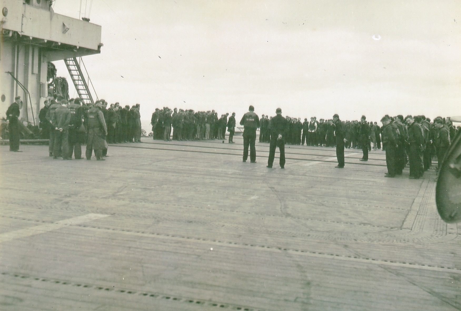 (NL15-NL16) Back at Scapa Flow, Capt Horatio Lay, CO, addresses the crew ((NL17) Crew of HMS NABOB formed up on the flight deck - possible a service for those lost (NL18) Newspaper article on the torpedoing of HMS NABOB (NL19) Leonard Love, George Meredith and others carrying one of their shipmates who was killed when HMS NABOB was torpedoed