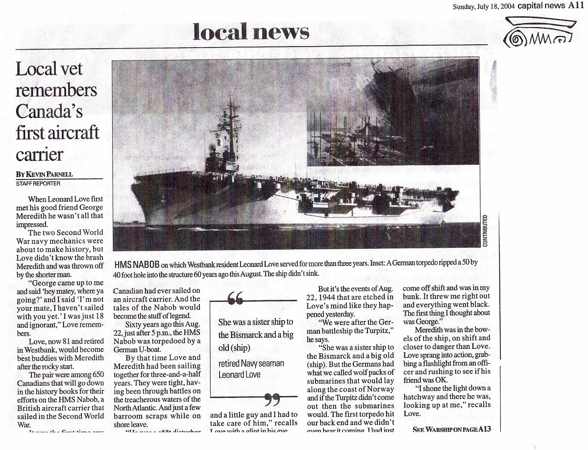 22 Aug 1944 - 50 Years later (NL22) Newspaper article on the 50th Anniversary of the torpedoing of HMS NABOB - 1994 (NL23) Souvenir of the crew reunion on the 50th Anniversary of the torpedoing of HMS NABOB (NL24) Reunion group photo (NL25-NL26) Letters from BC Premier Bill Van Der Zalm to Leonard Love and the attendees of the NABOB reunion