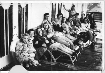 (LR001) Dutch War Bride Edith (née Kool) Hagen expresses her gratitude to the Master of the LADY RODNEY Rodney before disembarking (LR002) War brides enroute to Canada on board the LADY RODNEY - 1946 // Aartje Marie Brauner (nee VanDeventer) from Zeist, Netherlands is furthest on the right in the dark clothes. She married Lester William Brauner who was from Birch River, Manitoba. Lester Brauner was in the Canadian Army and part of the Liberation of Holland. They lived in Sheridan, Manitoba after the war, then farmed in the Birch River area. // From the collection of Aartje Marie Brauner // Courtesy of Kathy Fogh (LR003) Article on LADY RODNEY being returned to CNS Ltd // Montreal Gazette 08 Nov 1946